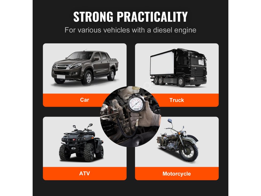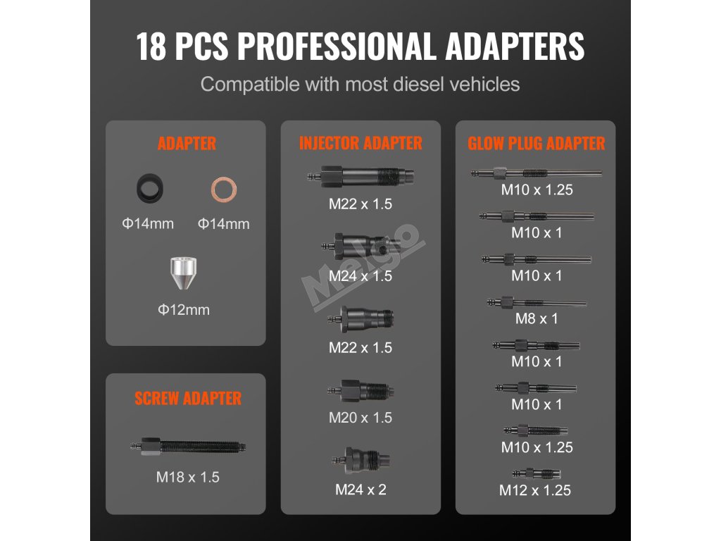 Díky 18 sadám specializovaných adaptérů náš tester bez problémů vyhovuje vznětovým motorům v různých vozidlech včetně osobních a nákladních automobilů, čtyřkolek, motocyklů a dalších běžných vozidel.
