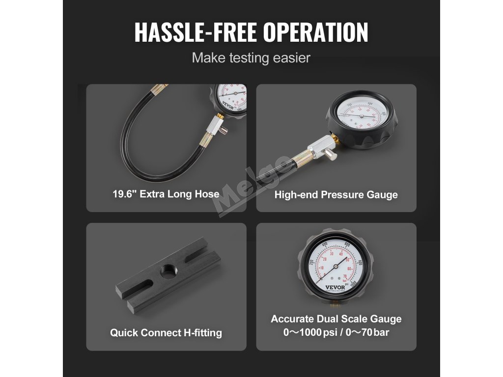 Díky mimořádně dlouhé 19,6" hadici, špičkovému manometru a rychlospojkám můžete tester snadno ovládat z jakéhokoli úhlu nebo polohy, což výrazně zvyšuje efektivitu vaší práce.