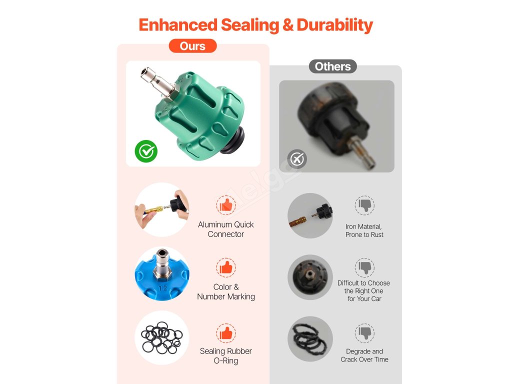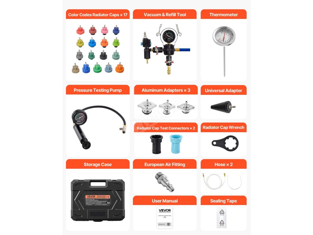Naše sada pro testování tlaku chladiče obsahuje několik velikostí adaptérů, které bezpečně pasují na otvory chladiče různých vozidel. Zvyšuje těsnost a zabraňuje únikům při podtlakových nebo tlakových operacích.