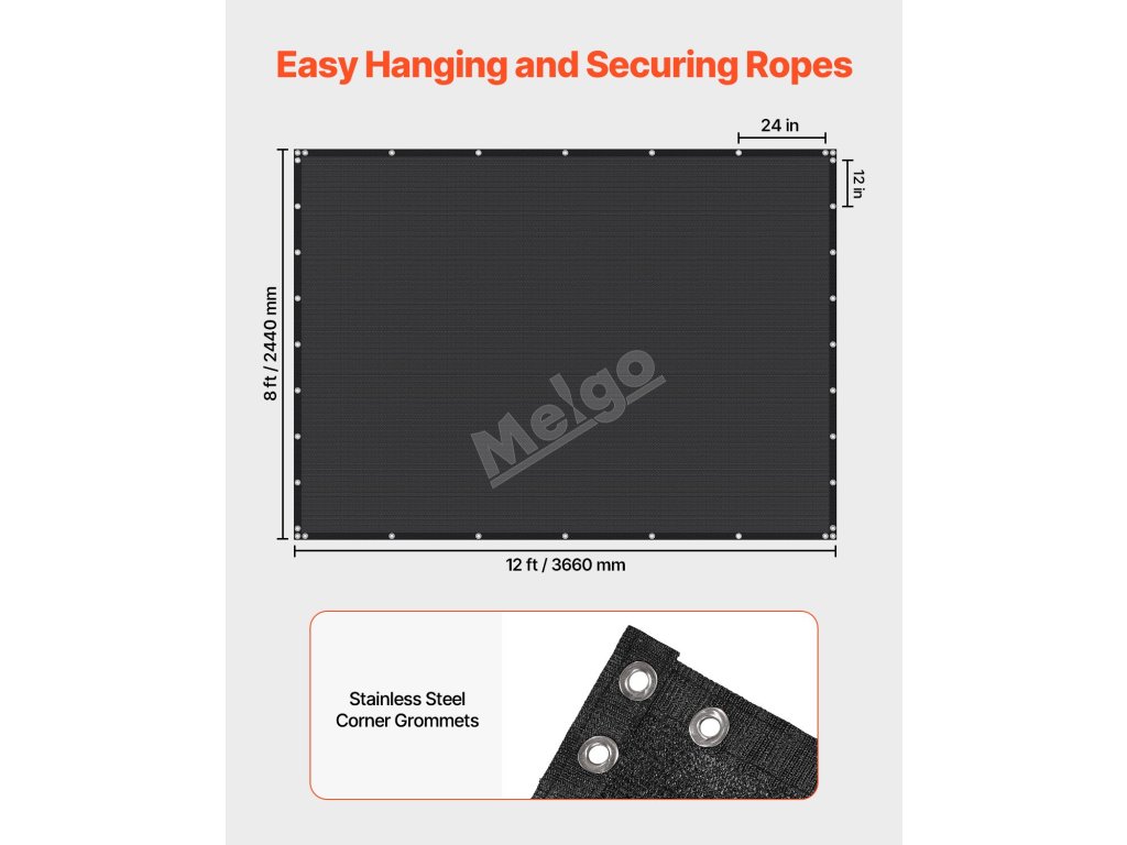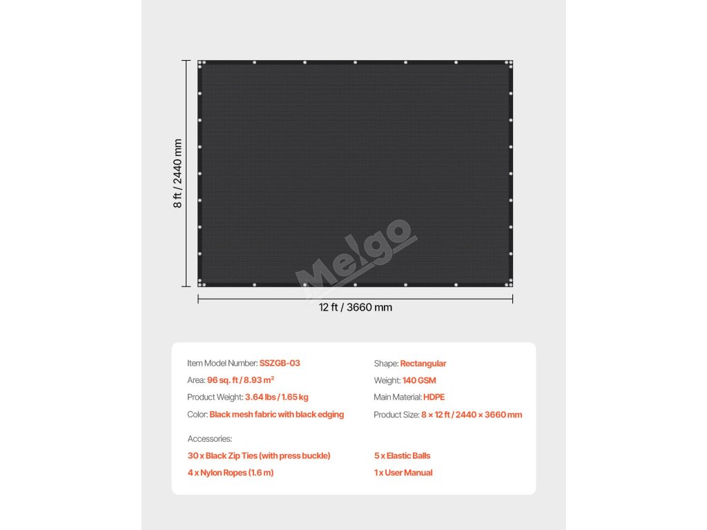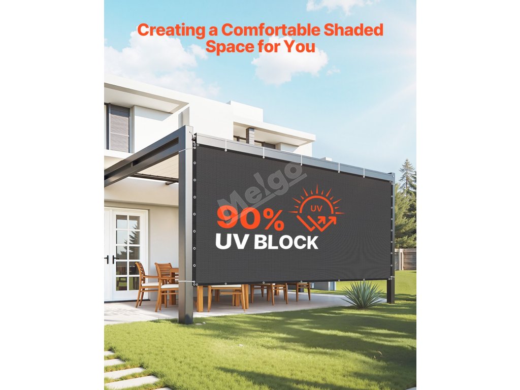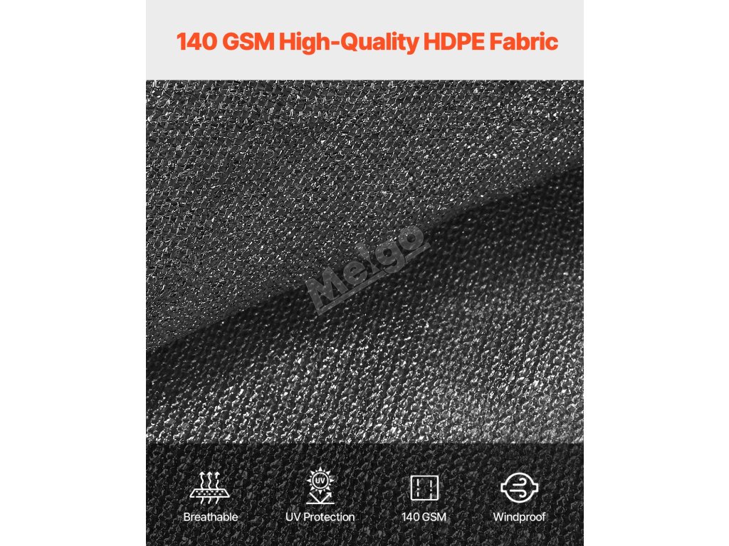 Tkanina HDPE s vysokou hustotou 140 GSM je odolná proti roztržení, nepromokavá a prodyšná. Blokuje sluneční světlo a zajišťuje trvalý stín a pohodlí. Díky průchodkám z nerezové oceli, 30 zipům, 5 elastickým kuličkám a 4 nylonovým provazům umožňuje flexibilní instalaci pro ochranu před sluncem a soukromí.