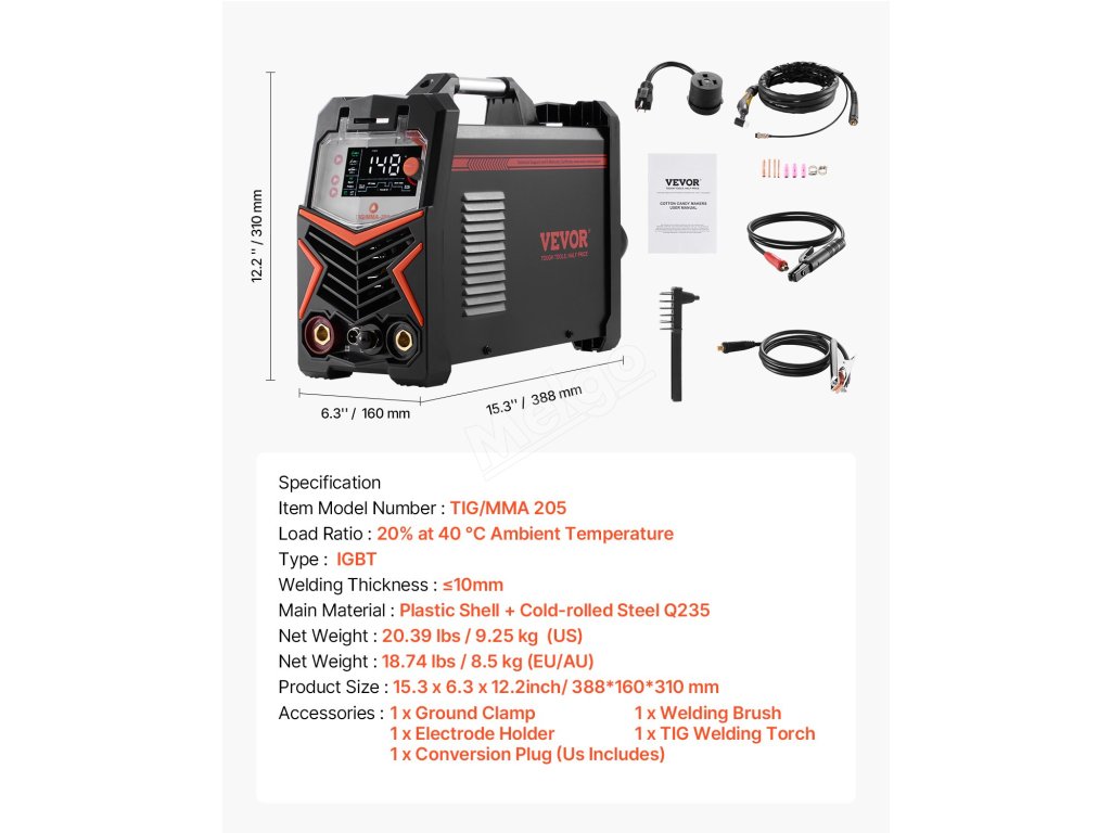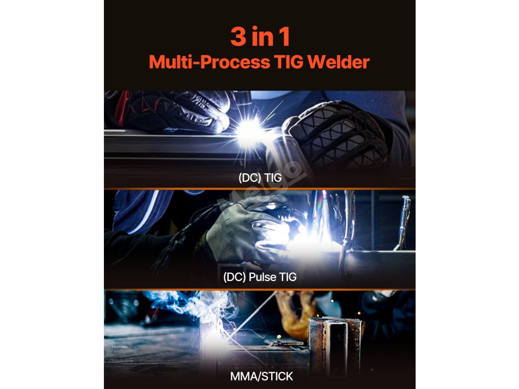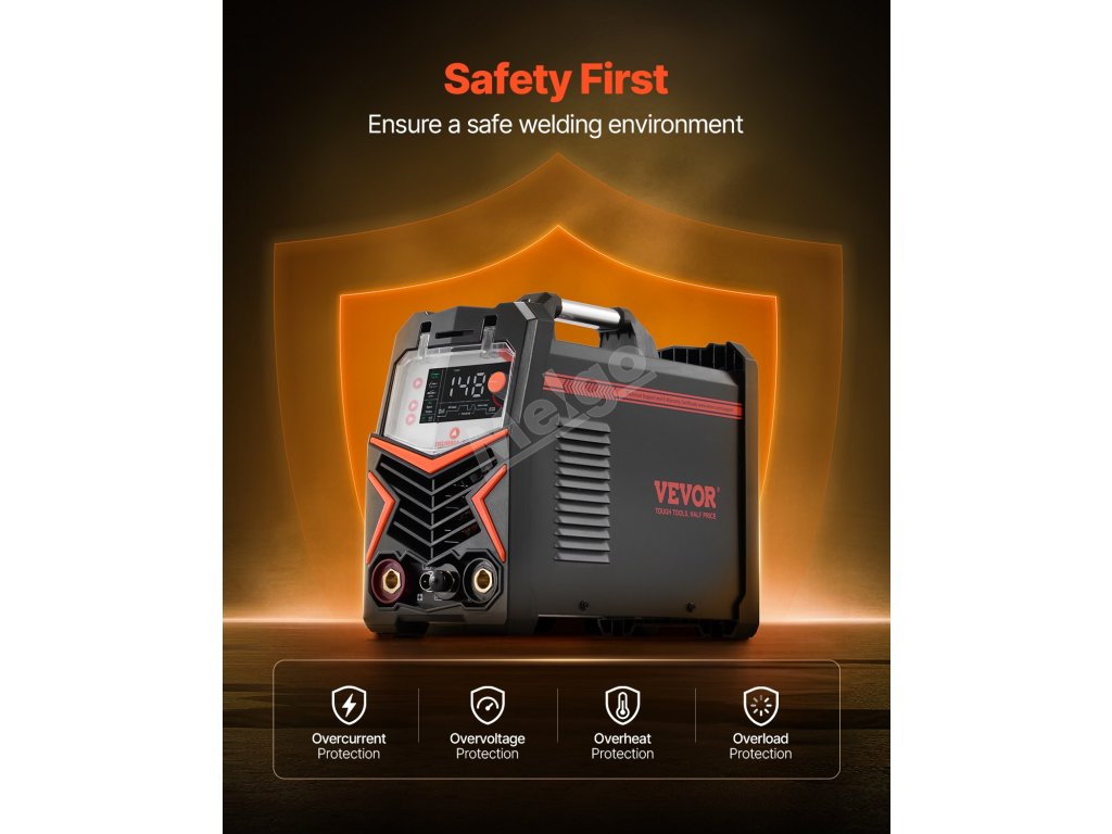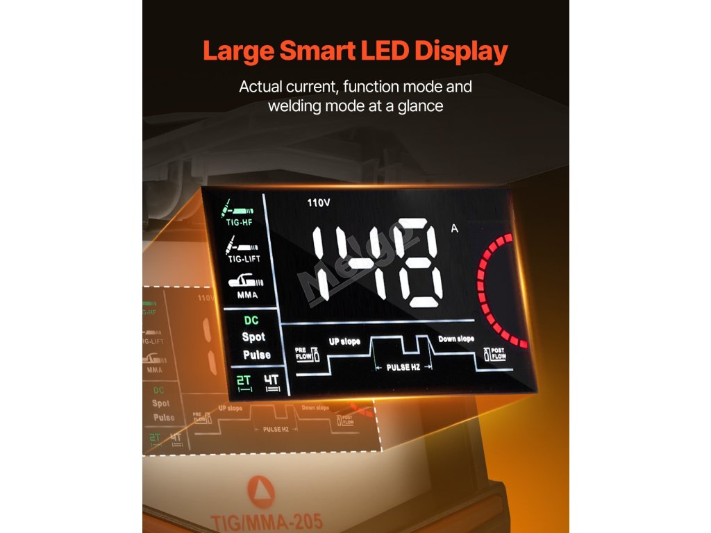 Tato svářečka 3 v 1 nabízí režimy DC TIG, pulzní TIG a MMA (svařování tyčí), které jsou ideální pro kutilské práce a opravy. Je vybavena inteligentním LED displejem, pracuje s různými kovy a obsahuje vysokofrekvenční start a bezpečnostní ochranu. Je lehká a přenosná pro snadné přenášení (váží 18,6 lbs/8,45 kg).