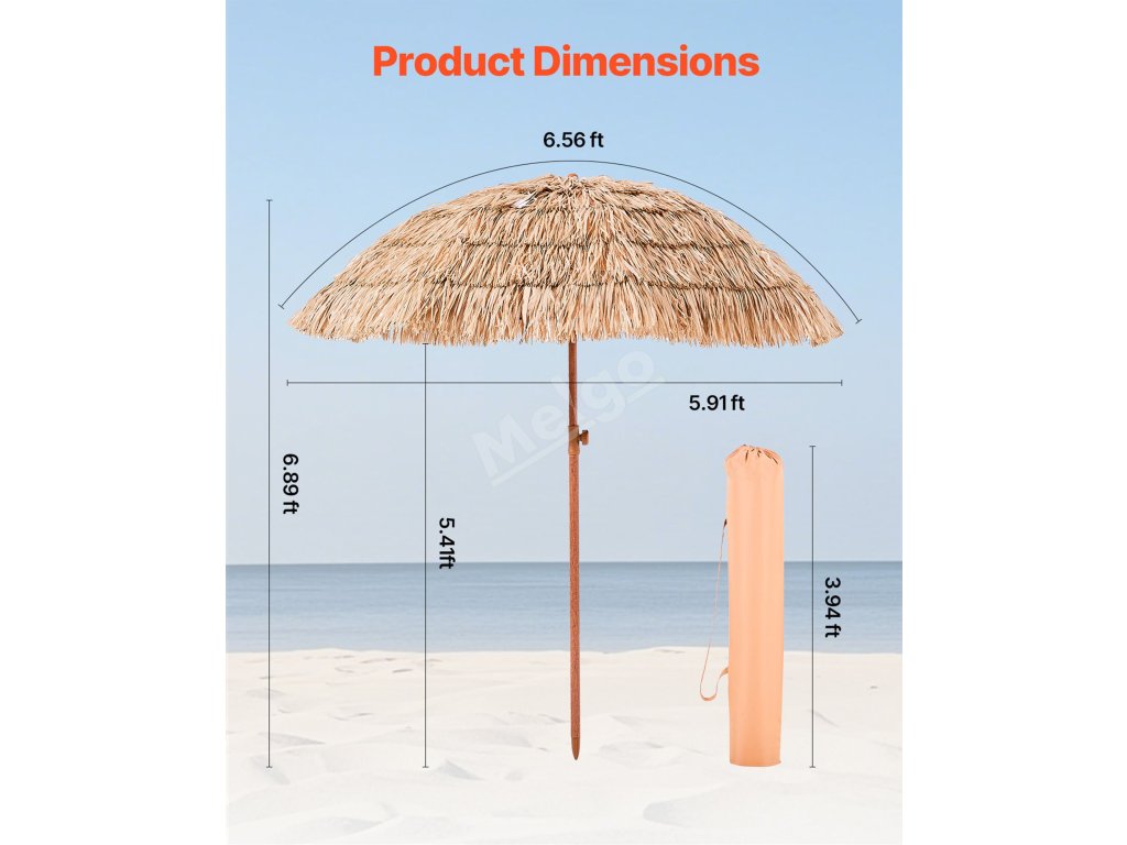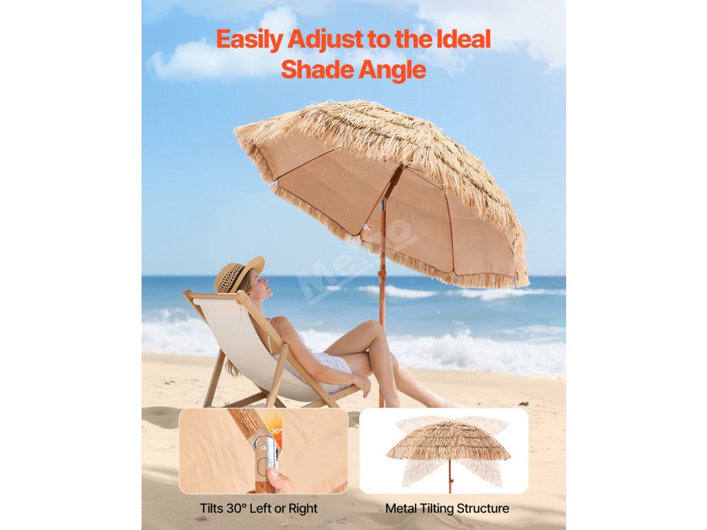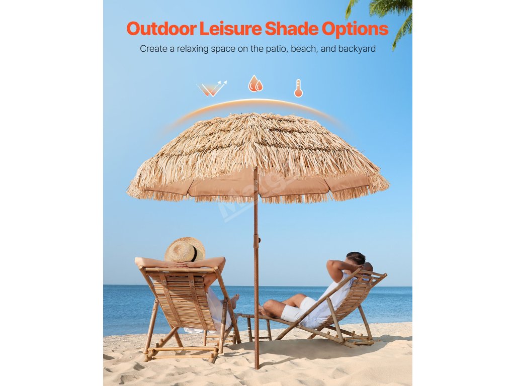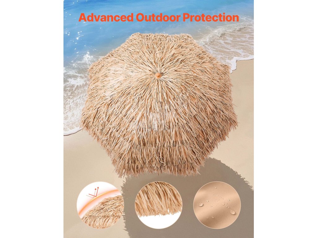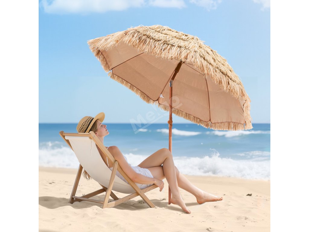 Tento plážový slunečník tiki je vyroben z vysoce kvalitního PP nosníku a polyesterové tkaniny. Jeho odolnost zvyšuje 8 kovových žeber s povrchovou úpravou nástřikem, díky nimž zůstává krásný a funkční i při dlouhodobém používání venku.
