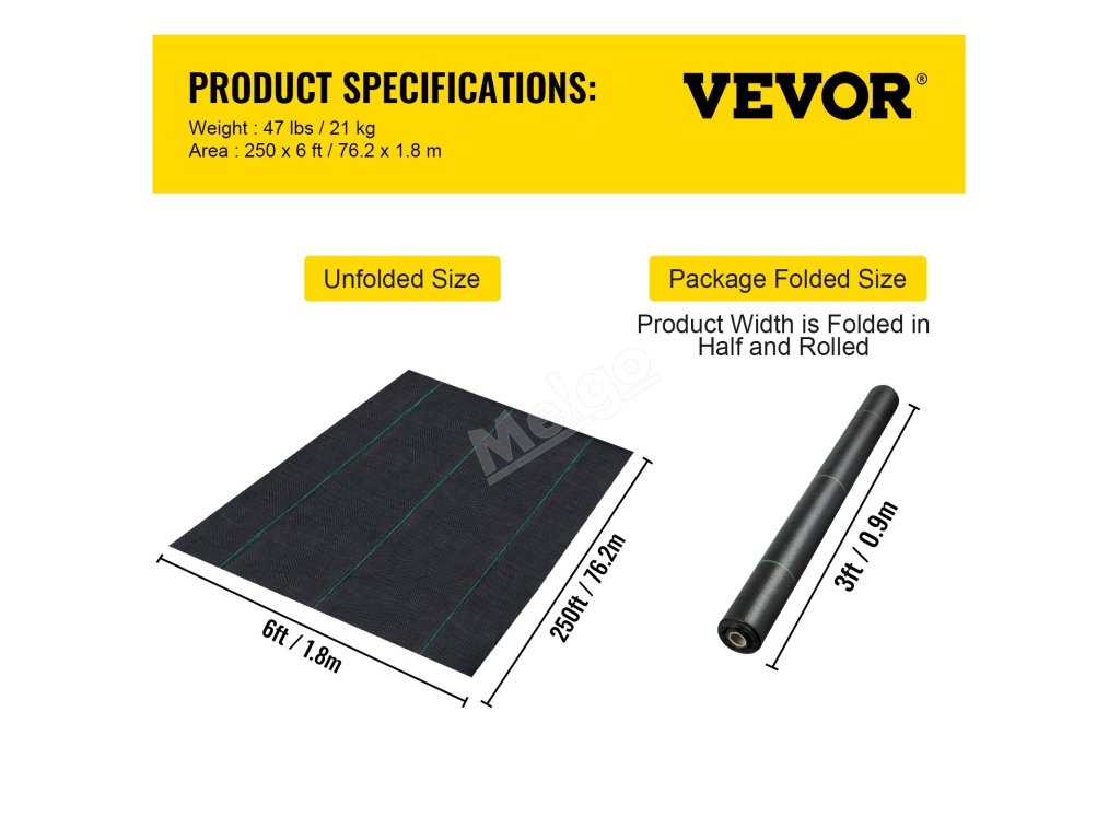 Tkanina na bariéru proti plevelu o hmotnosti 4,1 oz má velkou plochu pokrytí: velikost: 250 x 6 FT, hmotnost: 47 lbs/21 kg. Dokáže uspokojit vaše každodenní potřeby při dláždění zahrad a silnic.