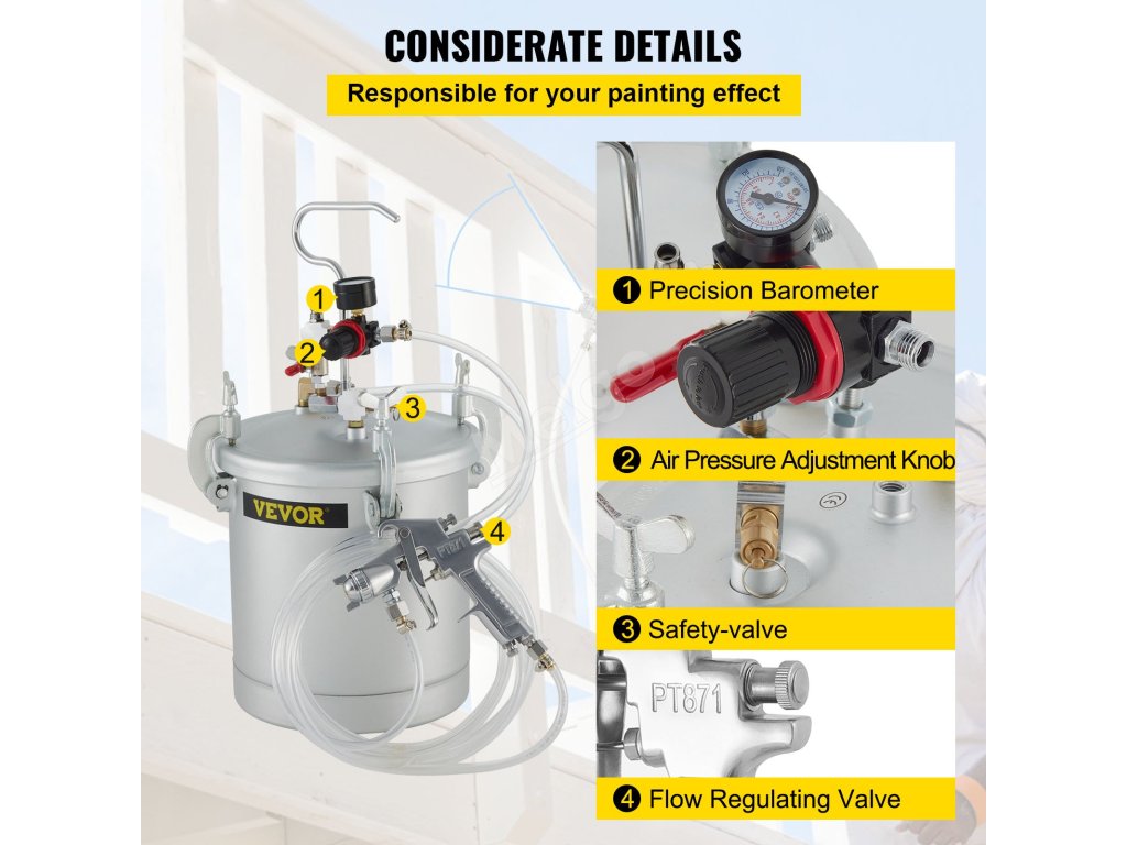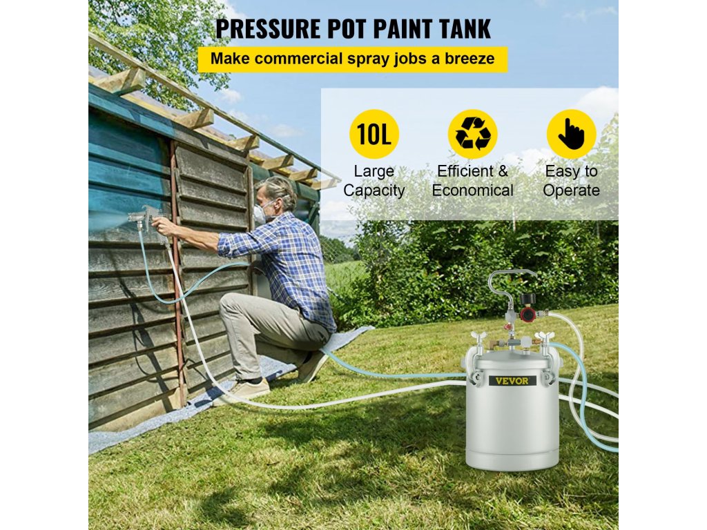Tlakové nádoby na barvu o objemu 10 litrů jsou dostatečně velké, aby pojaly velké množství barvy. Zatím používá zesílenou konstrukci nádoby, je vyrobena z vysoce kvalitní uhlíkové oceli, odolné proti korozi, kyselinám a zásadám.