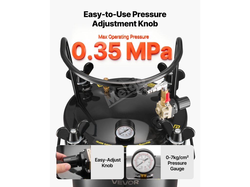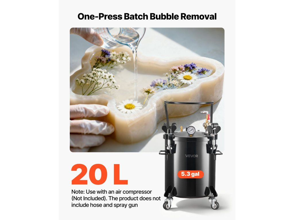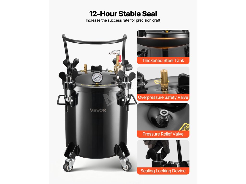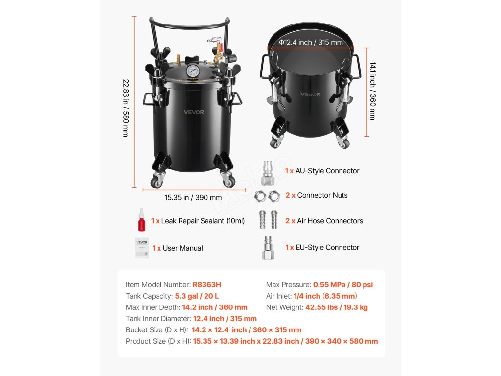 Tento tlakový kanystr na barvu o objemu 5,3 gal/20 l je určen pro nadšence do přemalovávání a zvládne velké objemy, takže můžete provádět více řemesel najednou. Provoz pod vysokým tlakem uvolňuje zachycený vzduch pro hladké povrchy a jemnější detaily a utěsněná konstrukce zajišťuje stabilní tlak pro kutily, řemeslníky a studia.