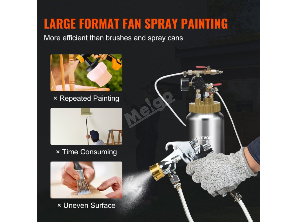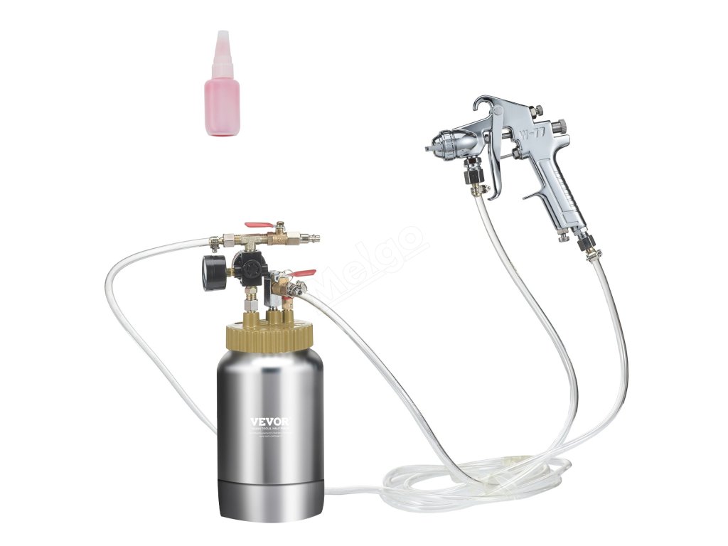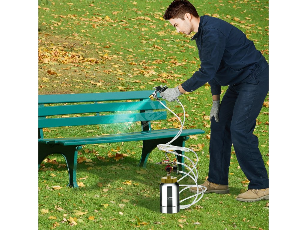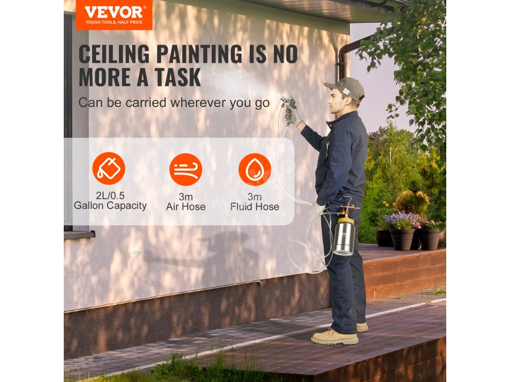Nádrž na stříkání VEVOR má lehký objem 2 l a konstrukci s 3m hadicovým nástavcem, který umožňuje snadné zavěšení na opasek pro malířské práce ve velkých výškách. Stříkací pistole o průměru 1,8 mm je kompatibilní s většinou barev a je dokonale použitelná pro malířské práce v oblasti bytové dekorace.
