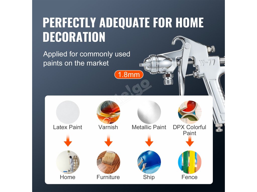1.pistole s 8mm tryskou je vhodná pro latexové barvy, barevné barvy DPX, laky, metalické barvy a další standardní barvy. Kromě toho lze naši stříkací pistoli sestavit podle velikosti částic.