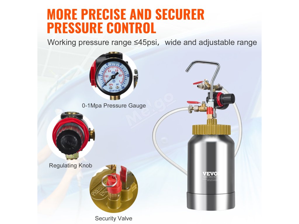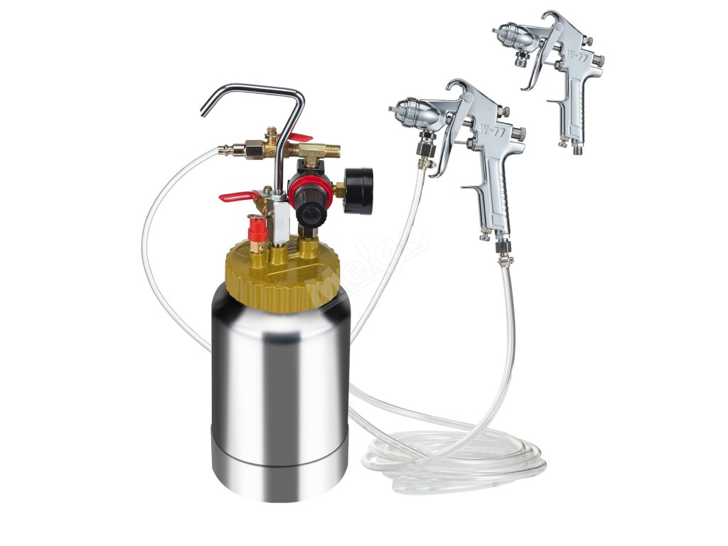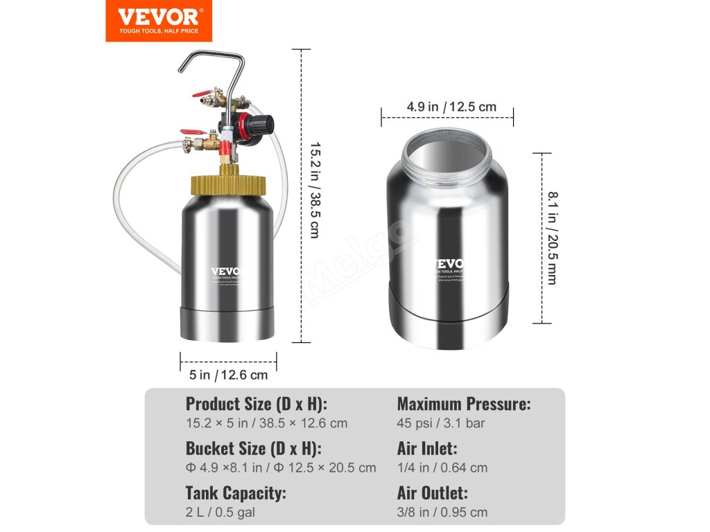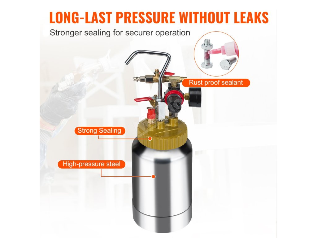 Tlakový hrnec má objem 2 litry/0,5 galonu se vstupními a výstupními otvory o průměru 1/4 palce a výstupem kapaliny o průměru 3/8 palce. Je vhodný pro více typů barev. Kloub o hmotnosti 4,1 kg se 2 hadicemi se snadno přenáší a vy můžete začít malovat, ať jste kdekoli!