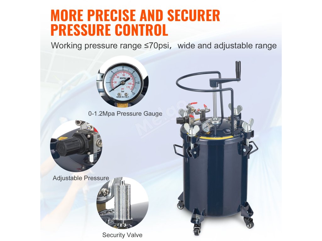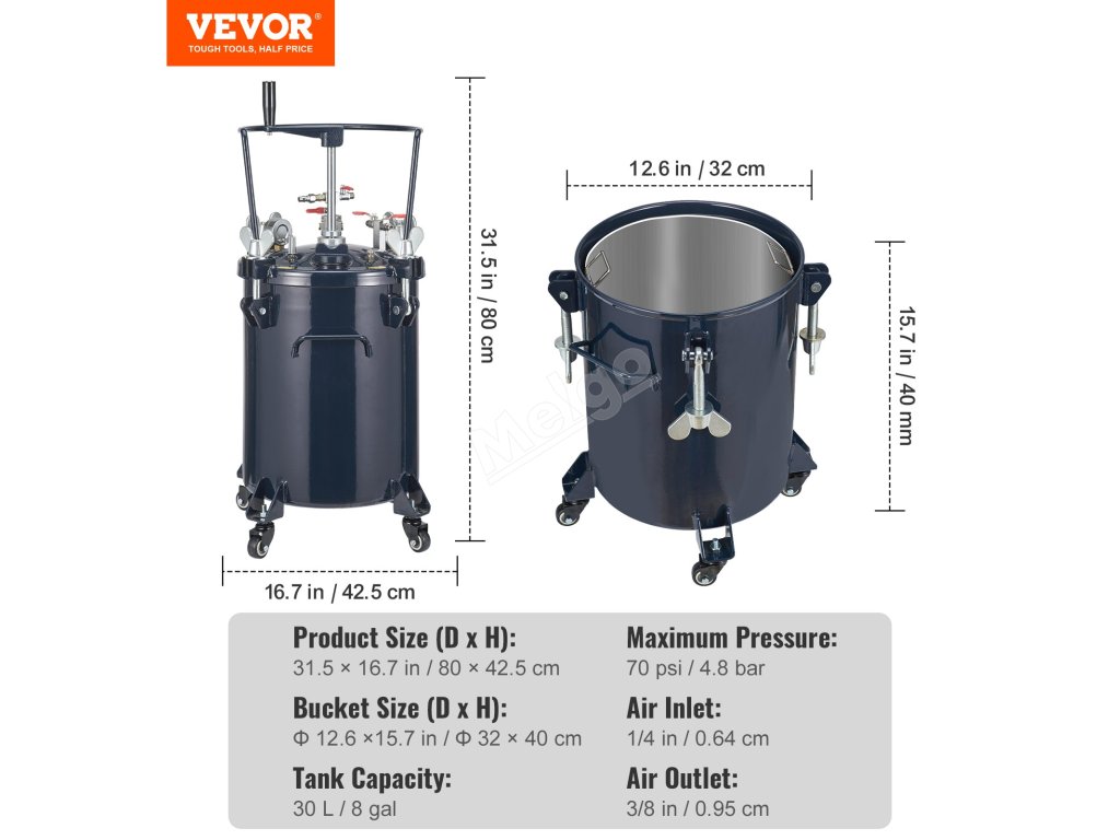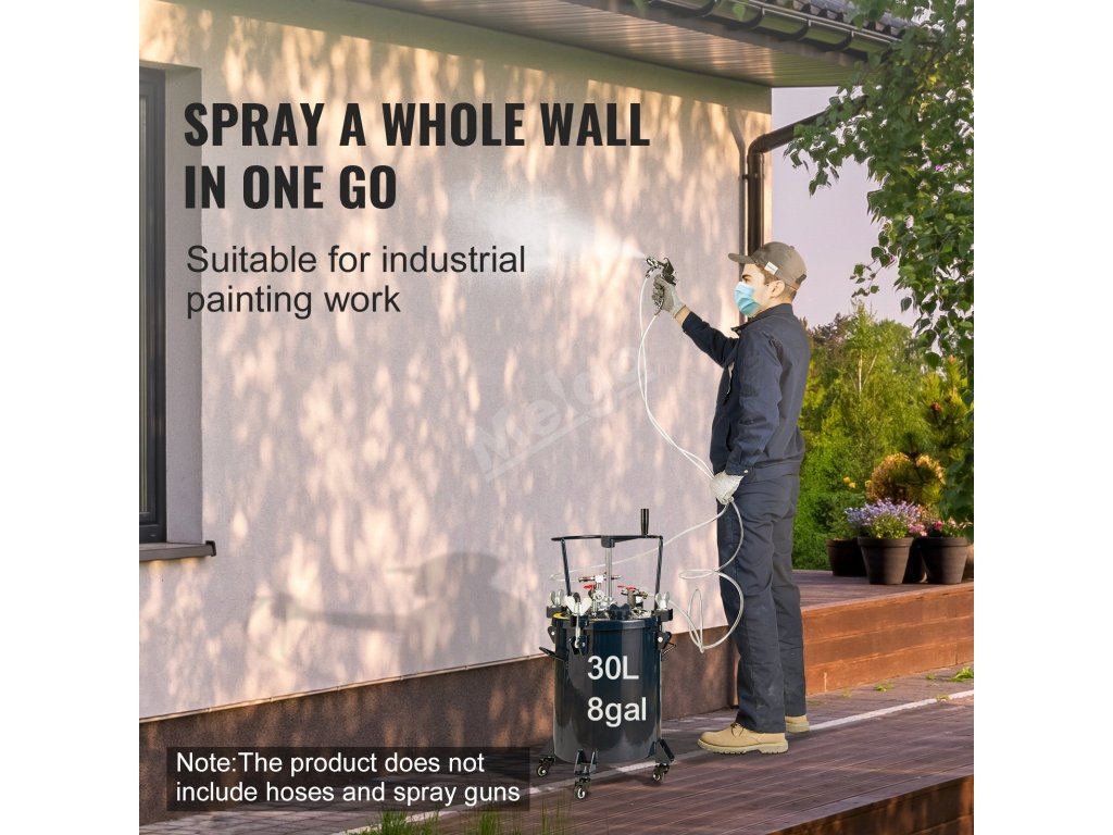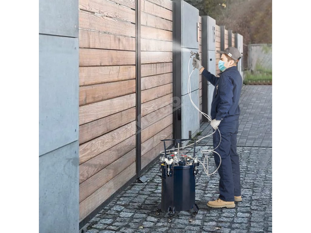 Tlaková nádoba má objem 30 l/8 galonů se vstupními a výstupními otvory o průměru 1/4 palce a výstupem kapaliny o průměru 3/8 palce. Zvládne více typů průmyslových nátěrů najednou.