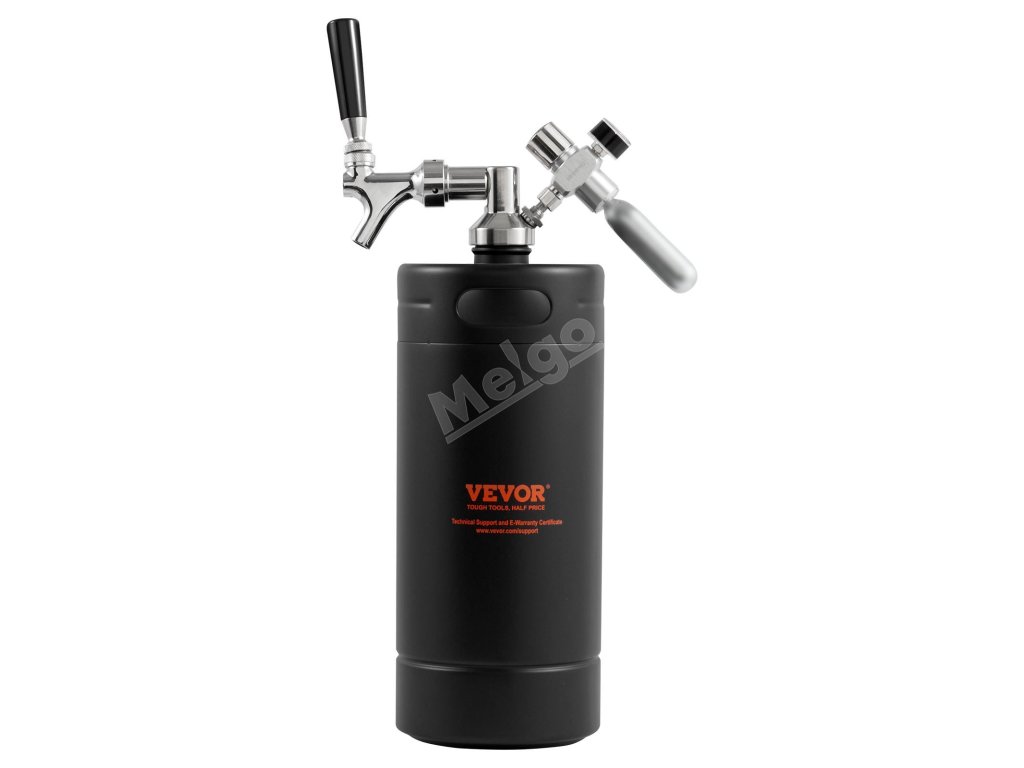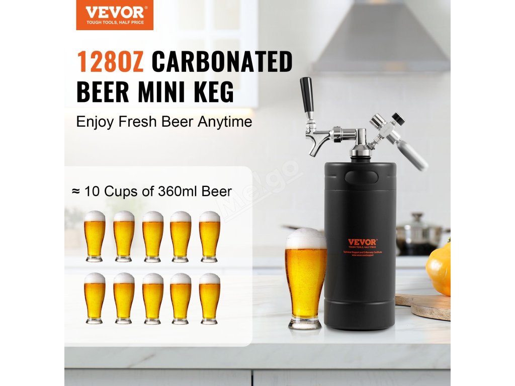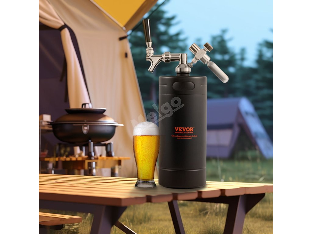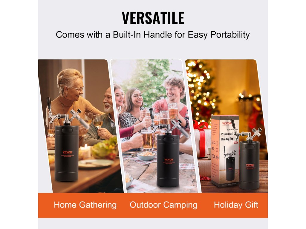 Miniaturní sud na sycené pivo o rozměrech 5,3 x 7,7 x 18,3 palce a objemu 128 uncí je vybaven pohodlným držadlem pro přenášení, takže je vhodný pro domácí setkání nebo kempování v přírodě.