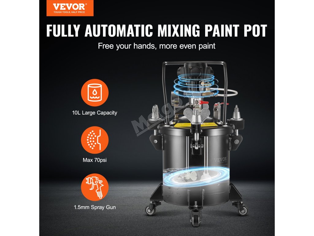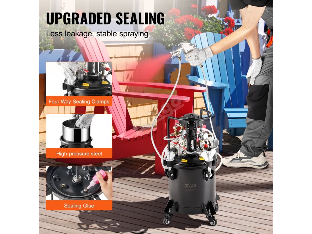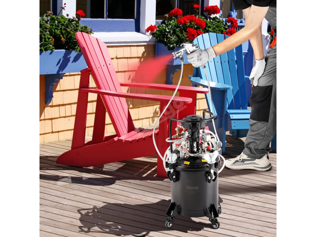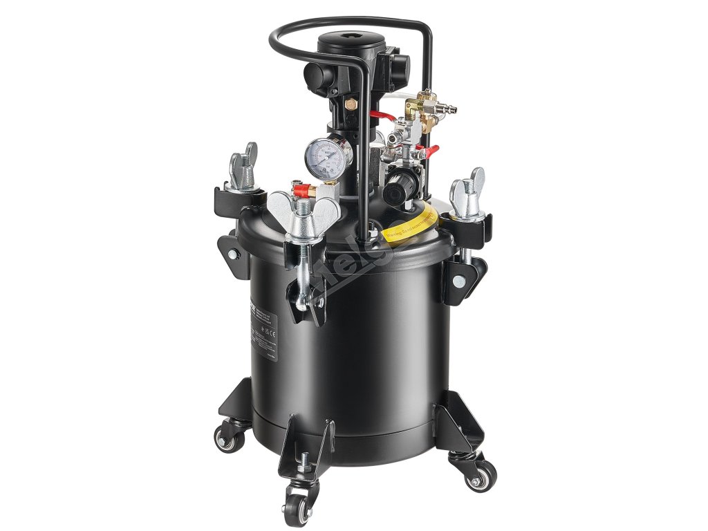 Velkokapacitní tlakový hrnec s automatickým mícháním barvy je ideální pro domácí i průmyslové lakování. Umožňuje pokrýt velké plochy najednou, což snižuje potřebu častého doplňování barvy.