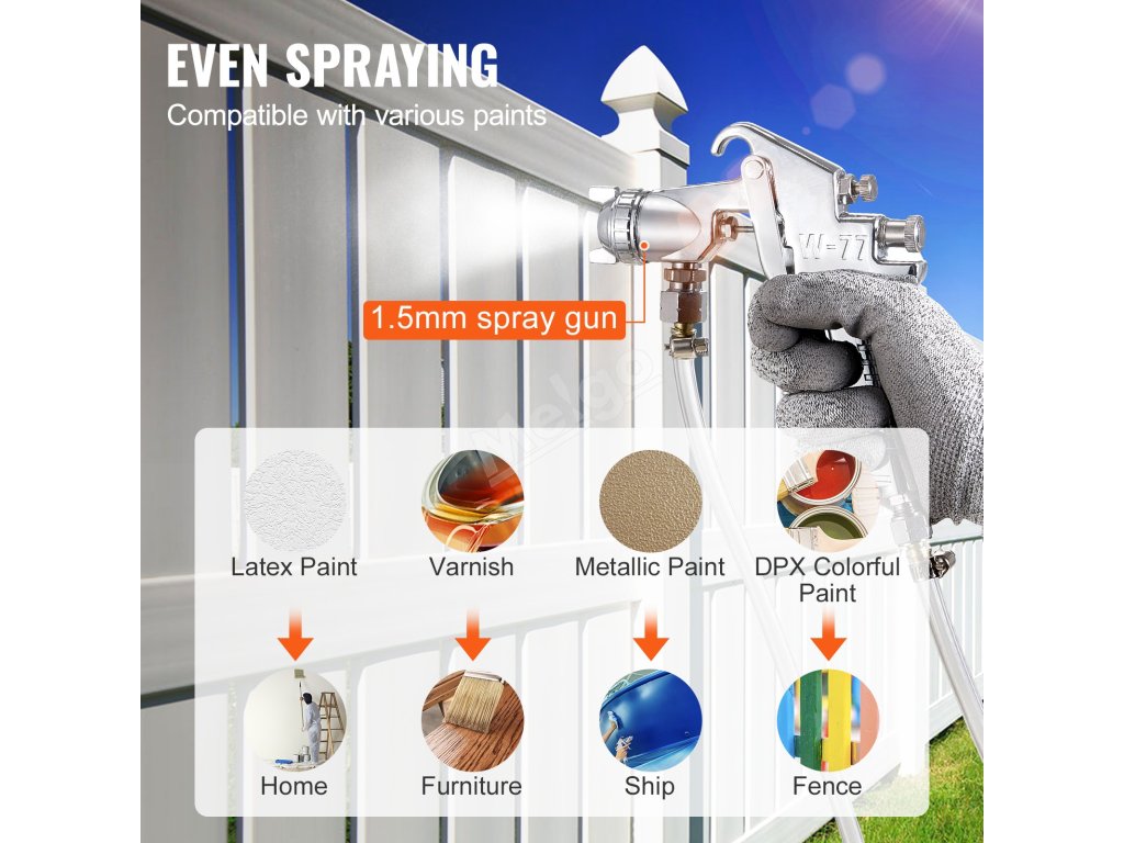 Stříkací pistole je vhodná pro běžné barvy, jako jsou latexové, vodou ředitelné pískové a metalické barvy. Je vybavena třemi nastavitelnými knoflíky pro regulaci tlaku vzduchu, průtoku barvy a tvaru nástřiku, které zajišťují rovnoměrné, vějířovité stříkání.