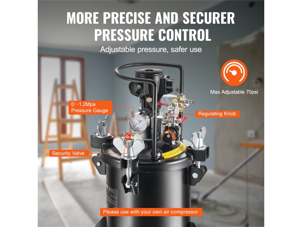 Používejte s vlastním vzduchovým kompresorem. Tlakový hrnec pracuje v tlakovém rozsahu ≤ 70 psi a je vybaven automatickým pojistným ventilem, který uvolní tlak, pokud překročí 0,5 MPa, a zajistí tak bezpečný provoz.