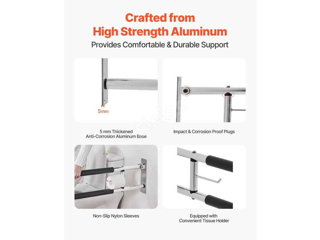 WC madlo poskytuje stabilnú oporu a umožňuje bezpečné a stabilné sedenie alebo státie. Zhrubnutá rúrka a protišmykové nylonové objímky zabezpečujú bezproblémové a bezpečné používanie. Tyč je vyrobená z vysokopevnostného kovu s rozšíreným rozsahom opory a držiakom papiera a ponúka ideálnu oporu a pohodlie.