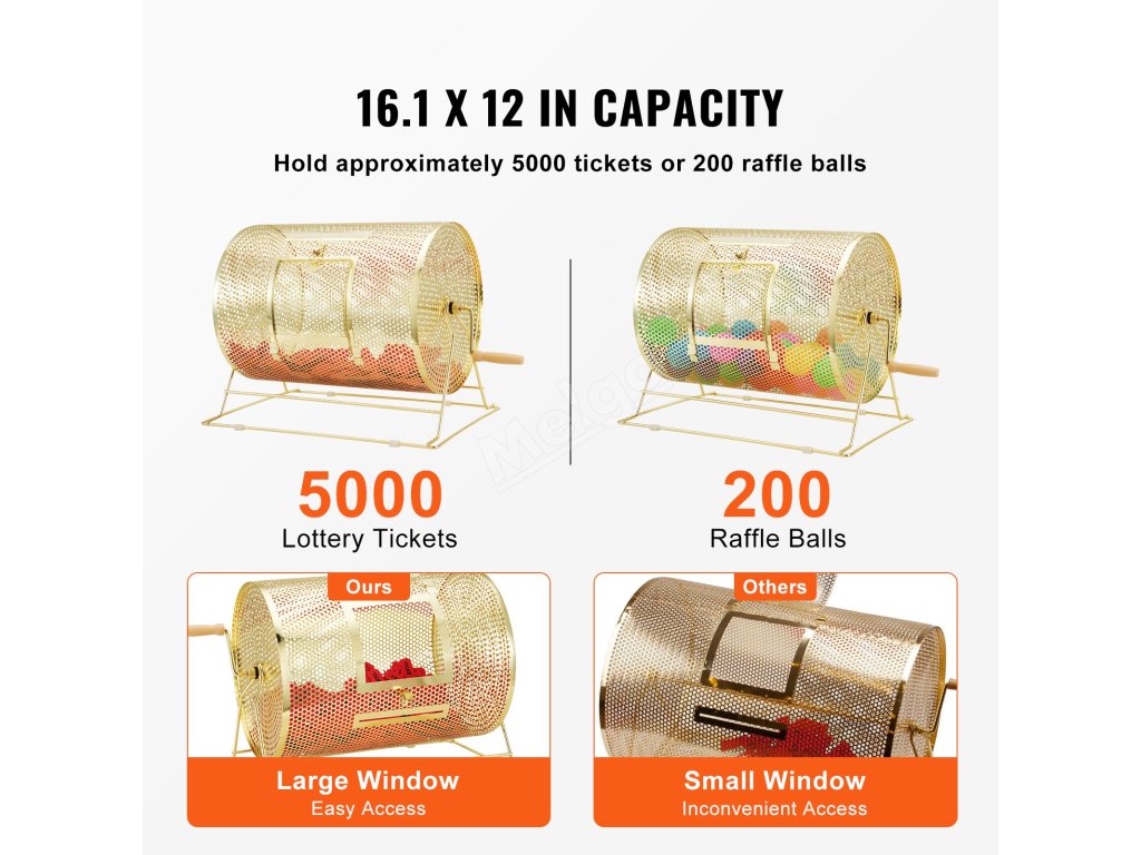 Do klece na tombolové lístky o rozměrech 16,1 x Ø12 palců / 409 x Ø304 mm se vejde přibližně 5 000 lístků nebo 200 pingpongových míčků, což je vhodné zejména pro velké akce nebo tomboly s velkým počtem účastníků.