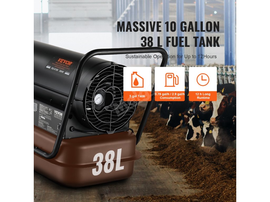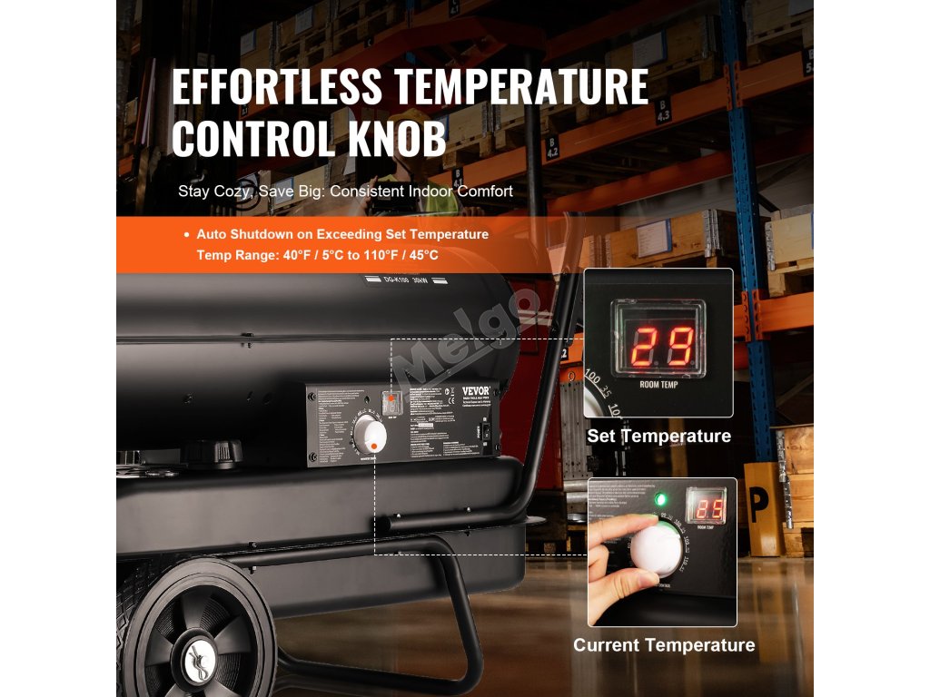 Tento petrolejový ohřívač účinně vytápí továrny, stodoly a farmy. Teplotu lze nastavit v rozmezí od 5 °C do 110 °C a po dosažení požadované teploty se zastaví, čímž šetří energii.