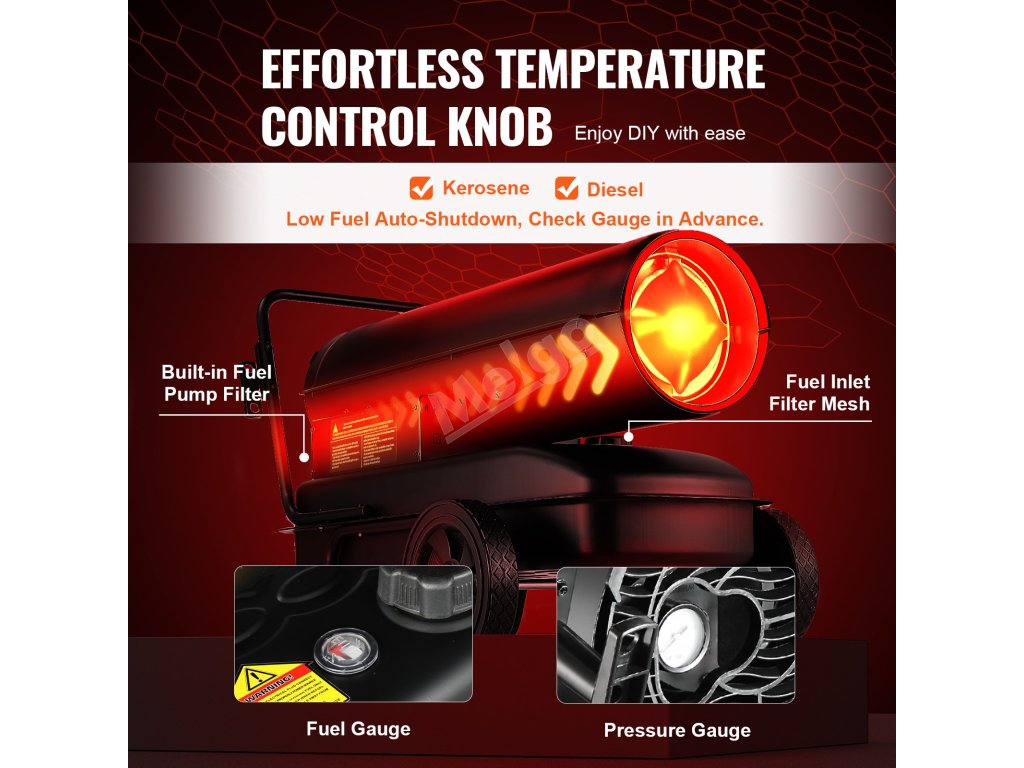 Tento ohřívač podporuje petrolej i naftu a nabízí flexibilitu použití. Používejte vždy jen jeden typ paliva. Automatické vypnutí při nedostatku paliva, ukazatel stavu paliva a dvojitá palivová filtrace pro čistší provoz