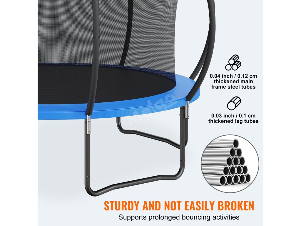 Vysoce odolná trampolína má vylepšené zesílené trubky nohou a pevnou kruhovou konstrukci nohou, která zvyšuje stabilitu a robustnost. Je méně pravděpodobné, že se ohne, a lze ji používat po dlouhou dobu.