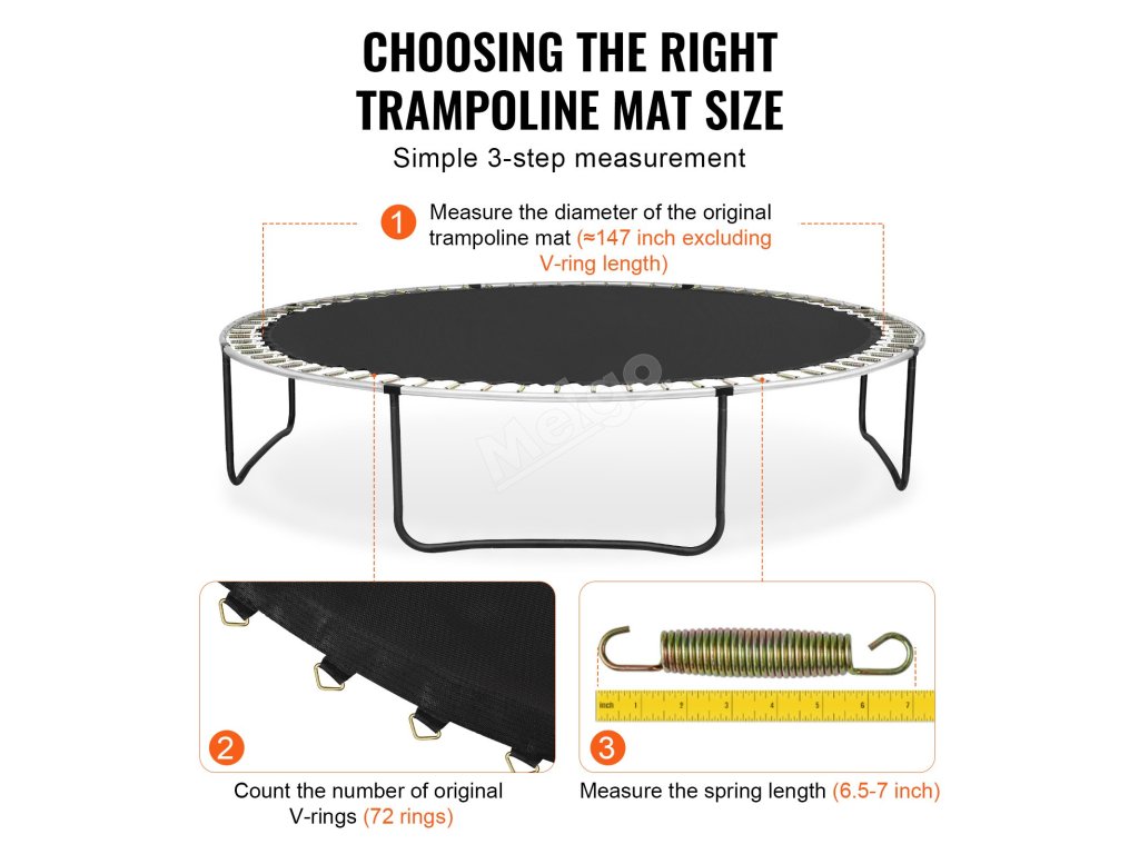 Vhodný pro 14stopé kruhové trampolíny se 72 V-kroužky, s pružinami o průměru 6,5-7 palců a průměrem podložky 147 palců. Poznámka: Rám a pružiny nejsou součástí dodávky.
