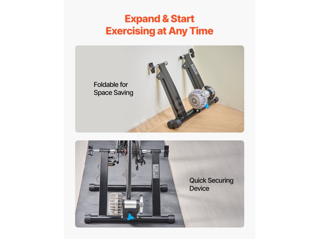 Tento cyklotrenažér má odolnou trojúhelníkovou konstrukci z uhlíkové oceli s protiskluzovými podložkami, které zvyšují stabilitu rámu. Je vybaven blokem pro zvedání předního kola, který udržuje kolo ve vodorovné poloze, a tichým motorem z hliníkové slitiny, který zajišťuje tichou jízdu a umožňuje vám soustředit se na trénink.