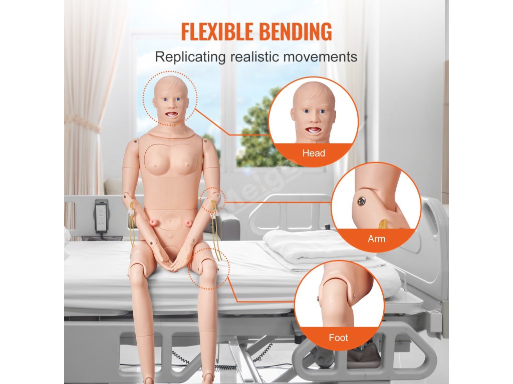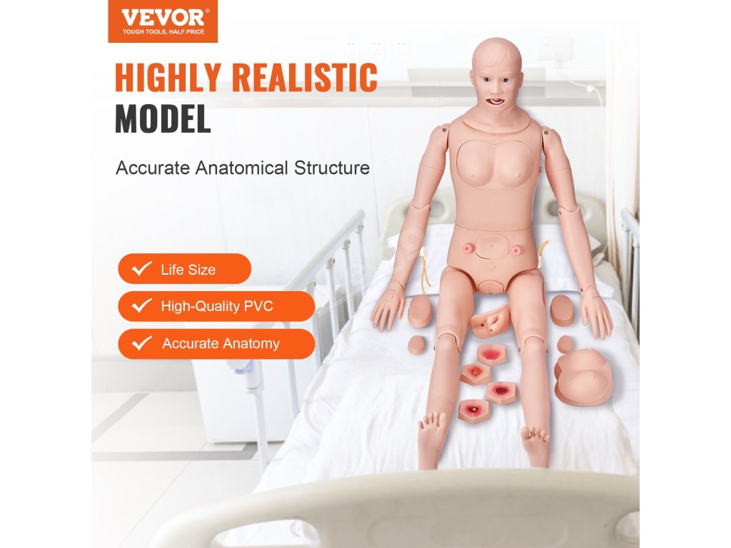 Naše ošetřovatelská figurína se vyznačuje přesnou anatomií a vysokou věrností. Napodobuje běžný rozsah lidských postojů a fyziologických činností, čímž napomáhá při výuce ošetřovatelství.
