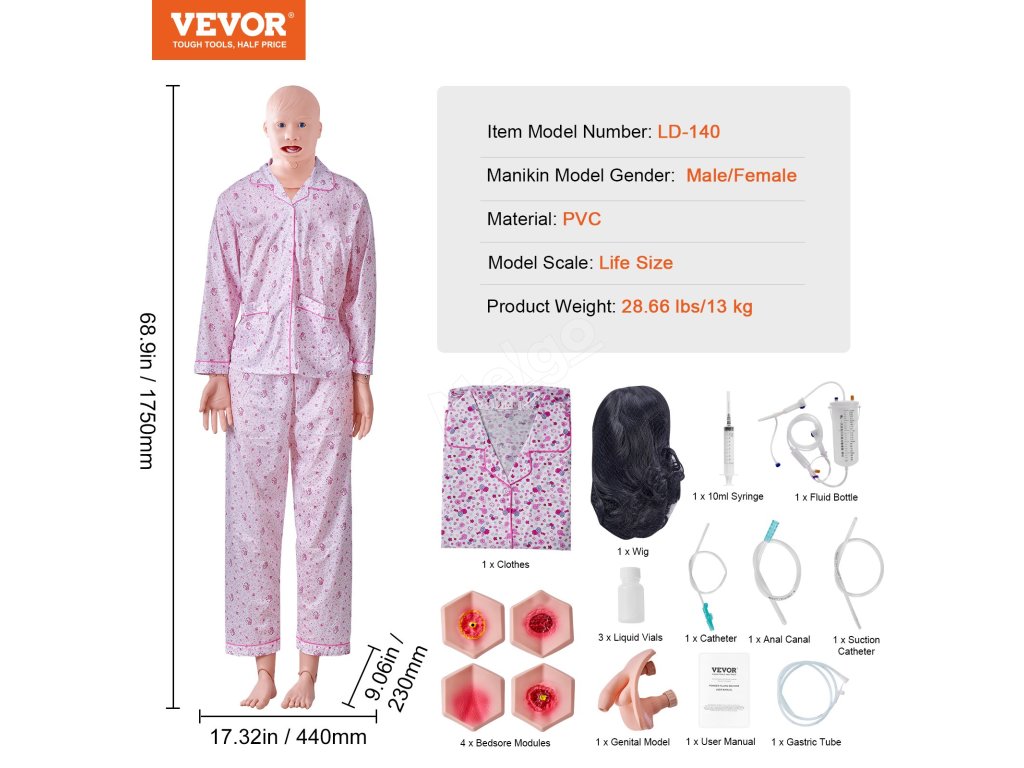 Tato ošetřovatelská figurína pokrývá širokou škálu ošetřovatelských technik, od základní péče o pacienta až po pokročilé dovednosti, jako je intubace, nasogastrická výživa, injekce, zavádění katétru, tracheostomie a stomie.
