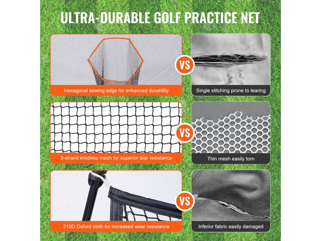 Tato sada golfové sítě je vybavena pevnými tyčemi ze skelných vláken, které jsou odolné a stabilní. Integrovaná spodní trubka zabraňuje uvolnění šroubů. Zemní kolíky ve tvaru písmene U zajišťují dvojí zpevnění a zbaví vás tak prostorových a časových omezení při tréninku.