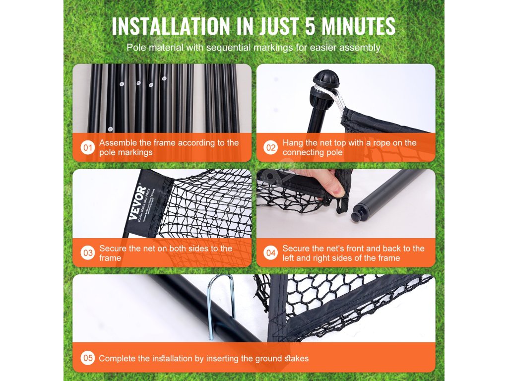 Tato tréninková síť na štěpkování je označena postupnými štítky na tyčích, takže montáž a demontáž je snadná a zabere pouhých 5 minut. Nebude vám nadměrně zabírat volný čas, což vám umožní ušetřit drahocenný čas a mít více času na golfovou zábavu.