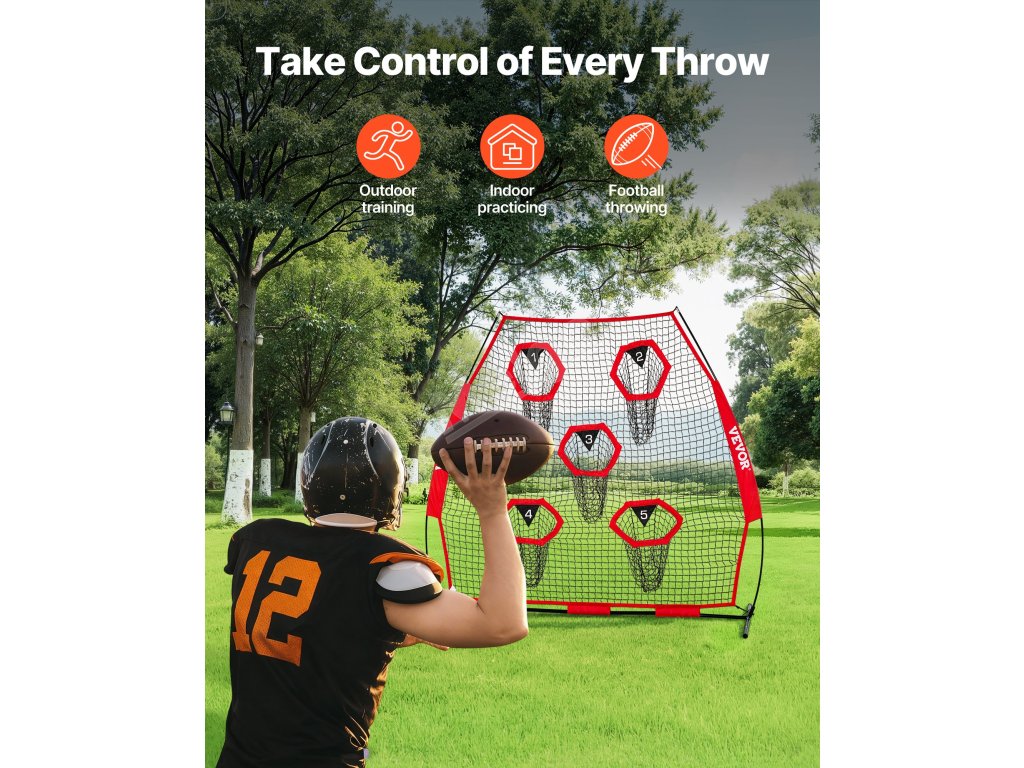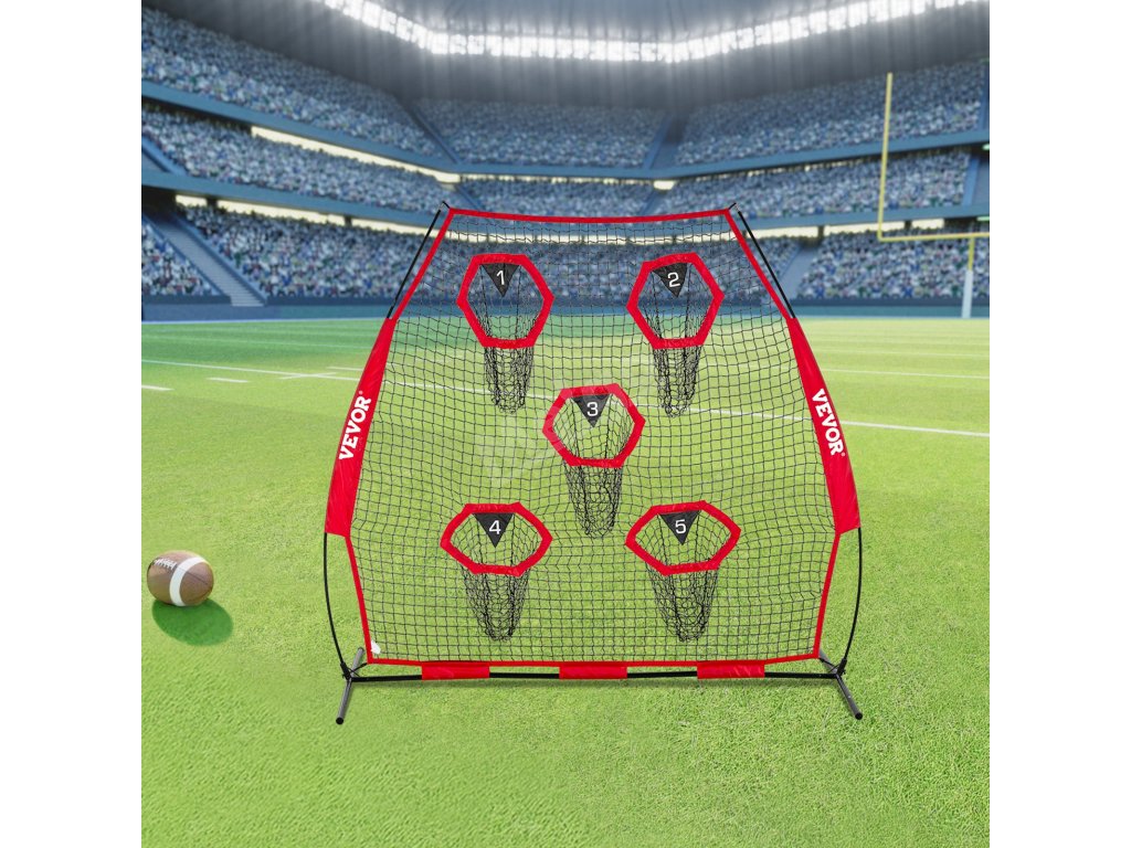 Tréninková fotbalová síť na házení na terč má velkou síť o rozměrech 7 × 7 stop a 5 terčových kapes, které vám umožní házet míč z různých směrů a vzdáleností.