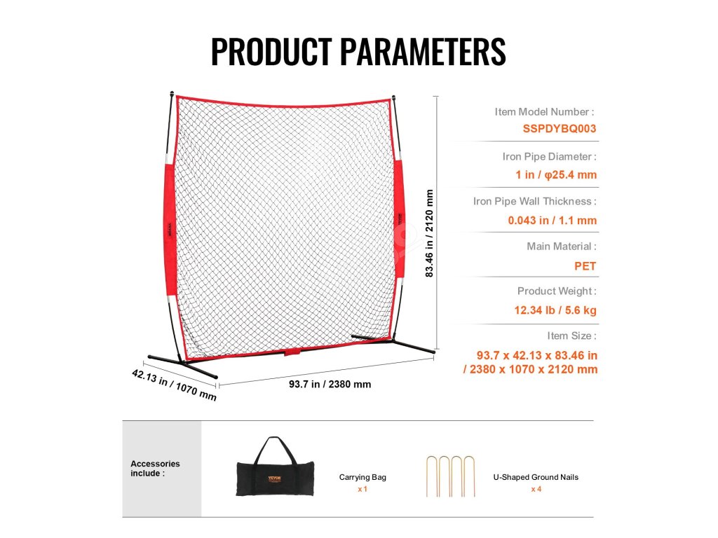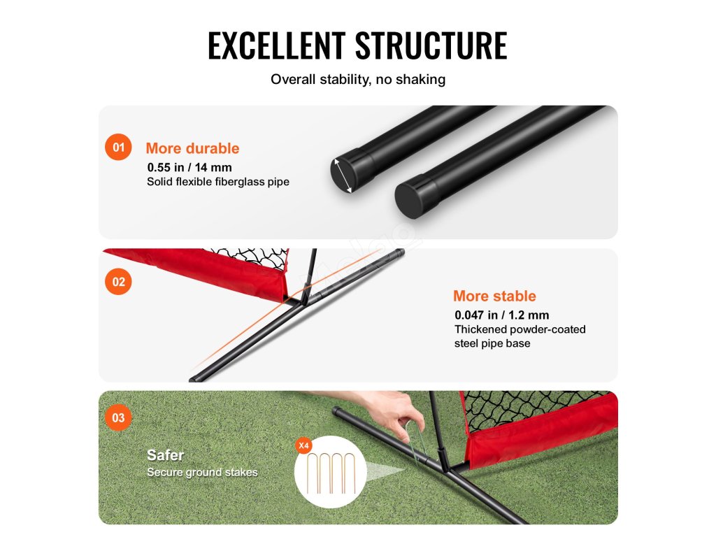 Tato přenosná tréninková síť využívá silné pružné tyče ze skleněných vláken, zesílenou základnu z práškově lakovaných ocelových trubek a bezpečné kolíky v zemi, které jsou stabilní a zatížené, což výrazně zvyšuje bezpečnost při sportu.