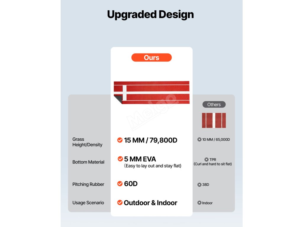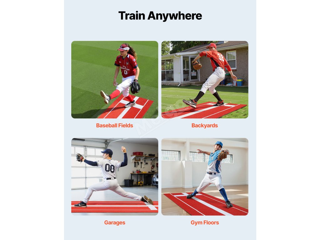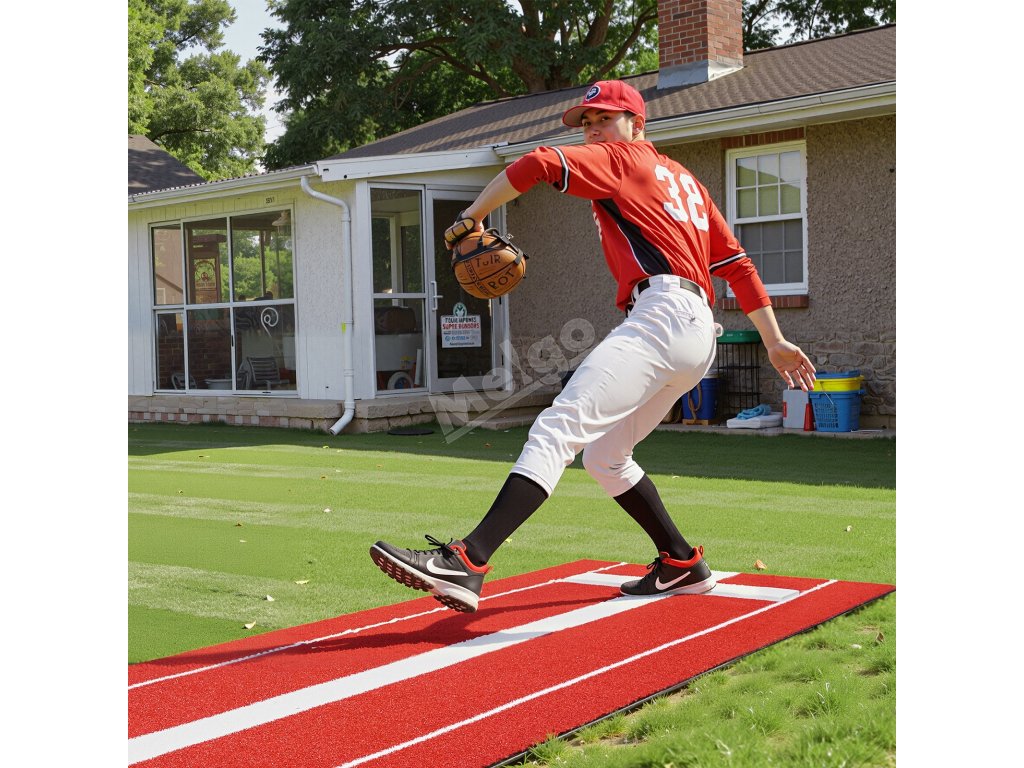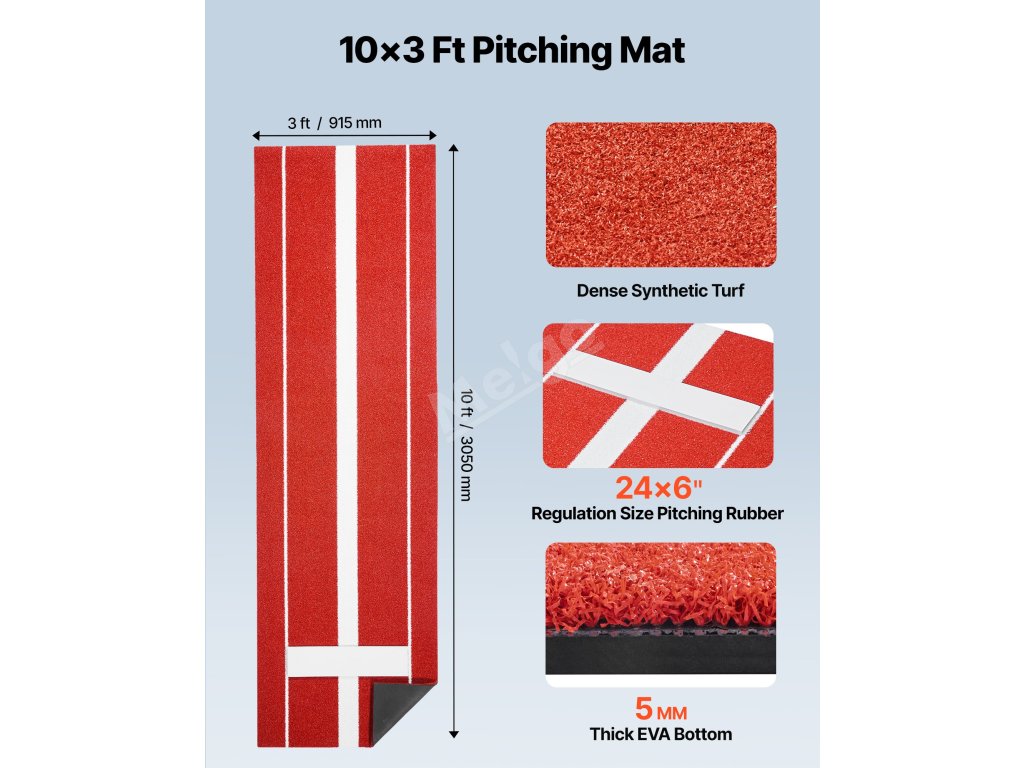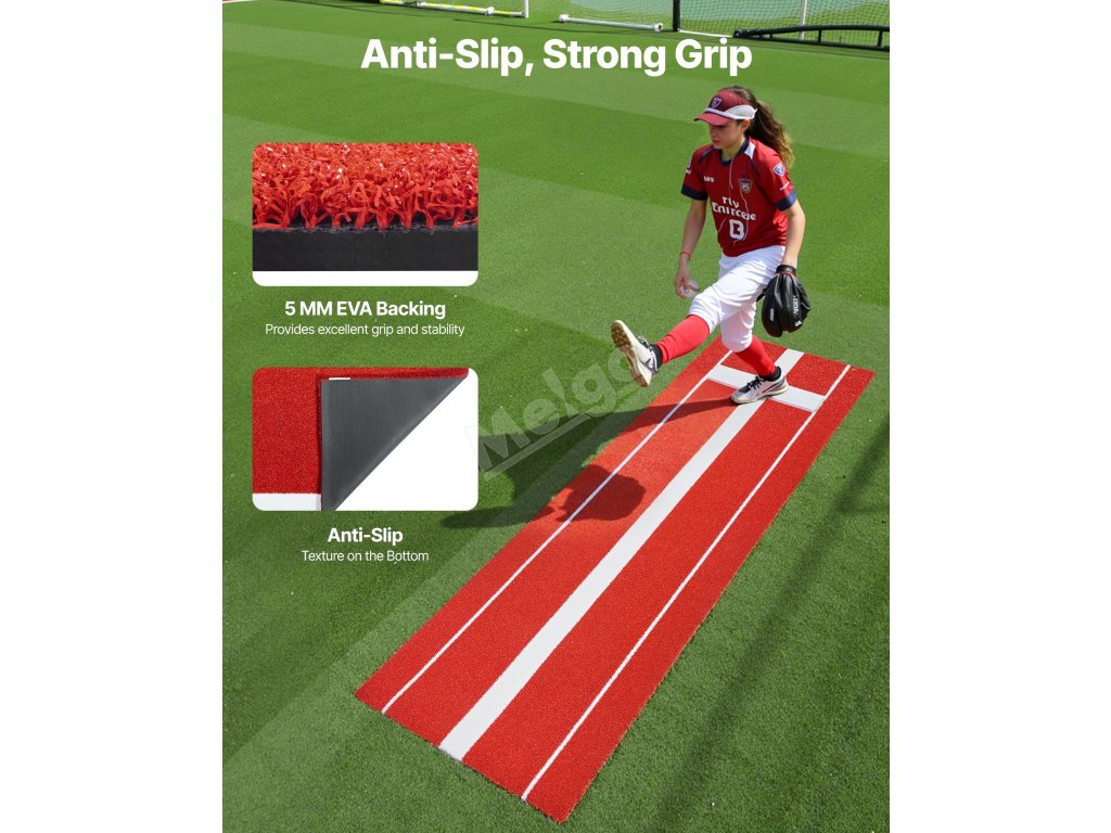 Tato rohož na hřiště má 5 mm podklad EVA, který zvyšuje tření, zabraňuje uklouznutí a chrání podlahu před poškrábáním a poškozením. Je vhodná pro trénink rychlého i pomalého nadhozu a slouží jako užitečná pomůcka pro baseballový trénink.