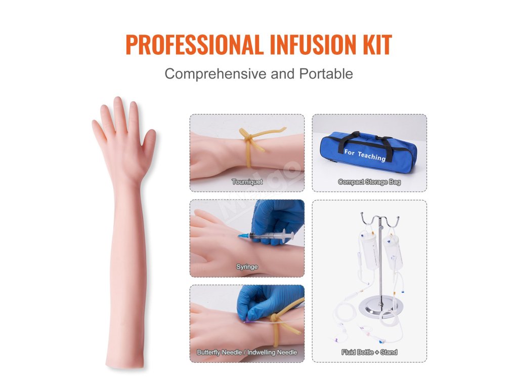 Jako profesionální souprava pro nácvik intravenózní infuze obsahuje vše potřebné zabalené v jedné praktické přenosné tašce - injekční stříkačku, infuzní hadičku, láhev s tekutinou, simulovanou krevní směs a motýlkovou jehlu. Cvičte kdykoli a kdekoli!