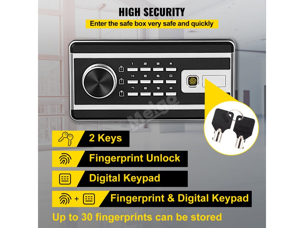 Tento bezpečnostní trezor má čtyři způsoby odemykání. K otevření trezoru můžete použít 2 klíče, digitální kód, otisk prstu nebo digitální klávesnici a otisk prstu. Kromě toho lze do tohoto bezpečnostního trezoru uložit až 30 otisků prstů, aby vyhovoval vašim potřebám.