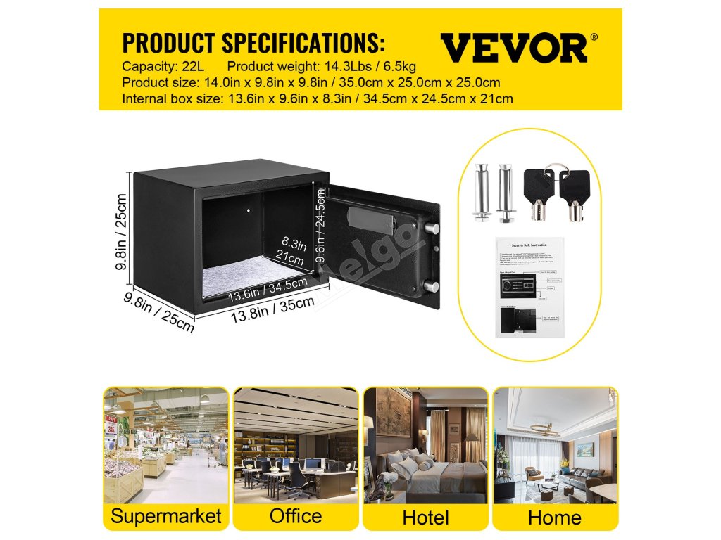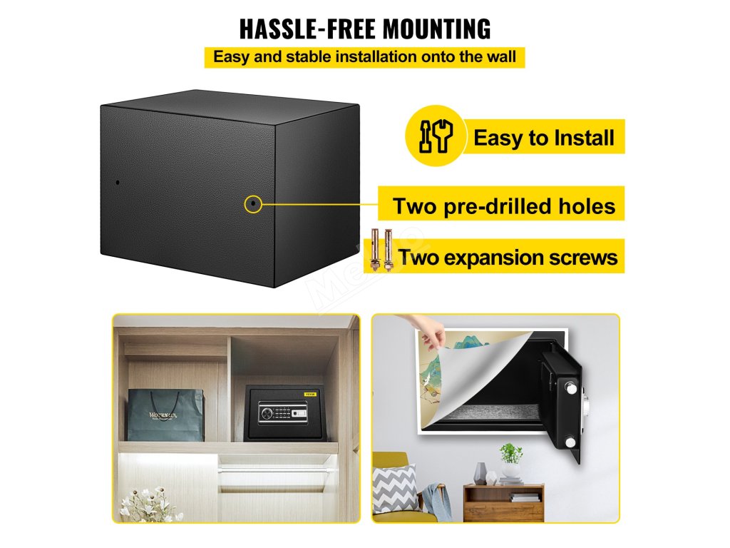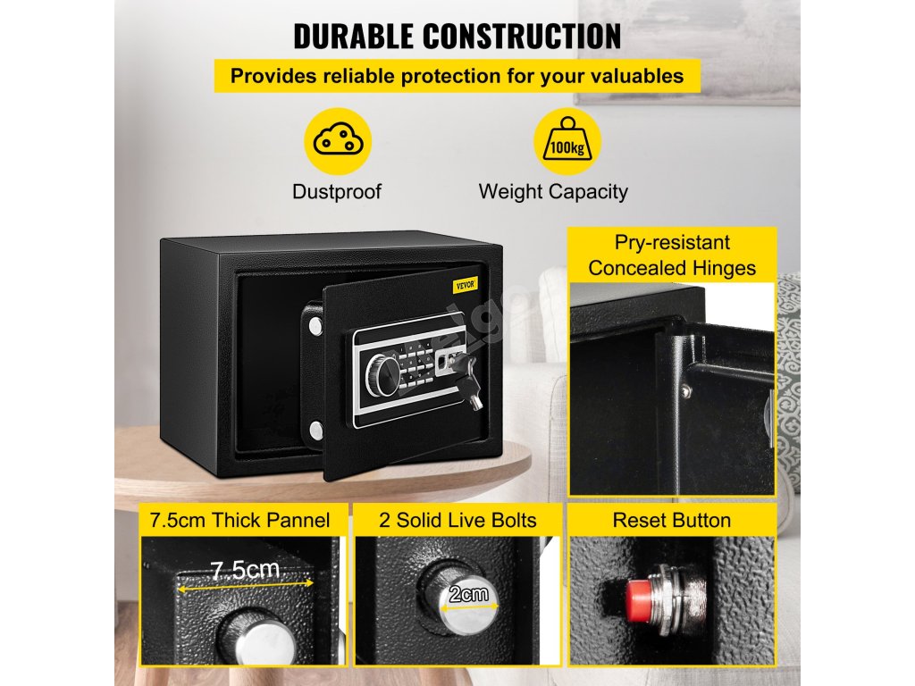 Tento trezor je vyroben z pevného ocelového plechu Q235 o tloušťce 1,2 mm, který je odolný proti prachu, a má nosnost až 22 liber/10 kg pro uložení mnoha cenností. Koberec by také mohl poskytnout dodatečnou ochranu vašich věcí.