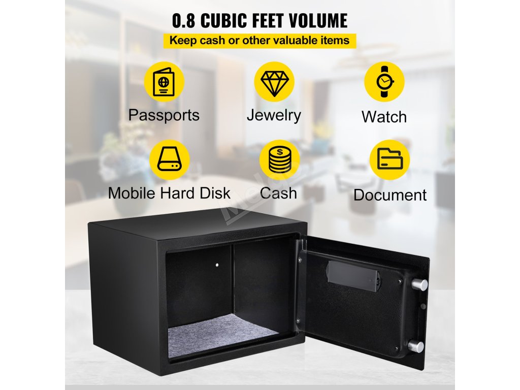 Objem bezpečnostní schránky pro domácnost je 0,8 stopy krychlové. Úložný prostor je vhodný pro uložení hotovosti, fotoaparátu, dokumentů, hodinek, pasů, šperků, mobilního pevného disku atd. Trezor splní všechny vaše každodenní potřeby pro ukládání dat.