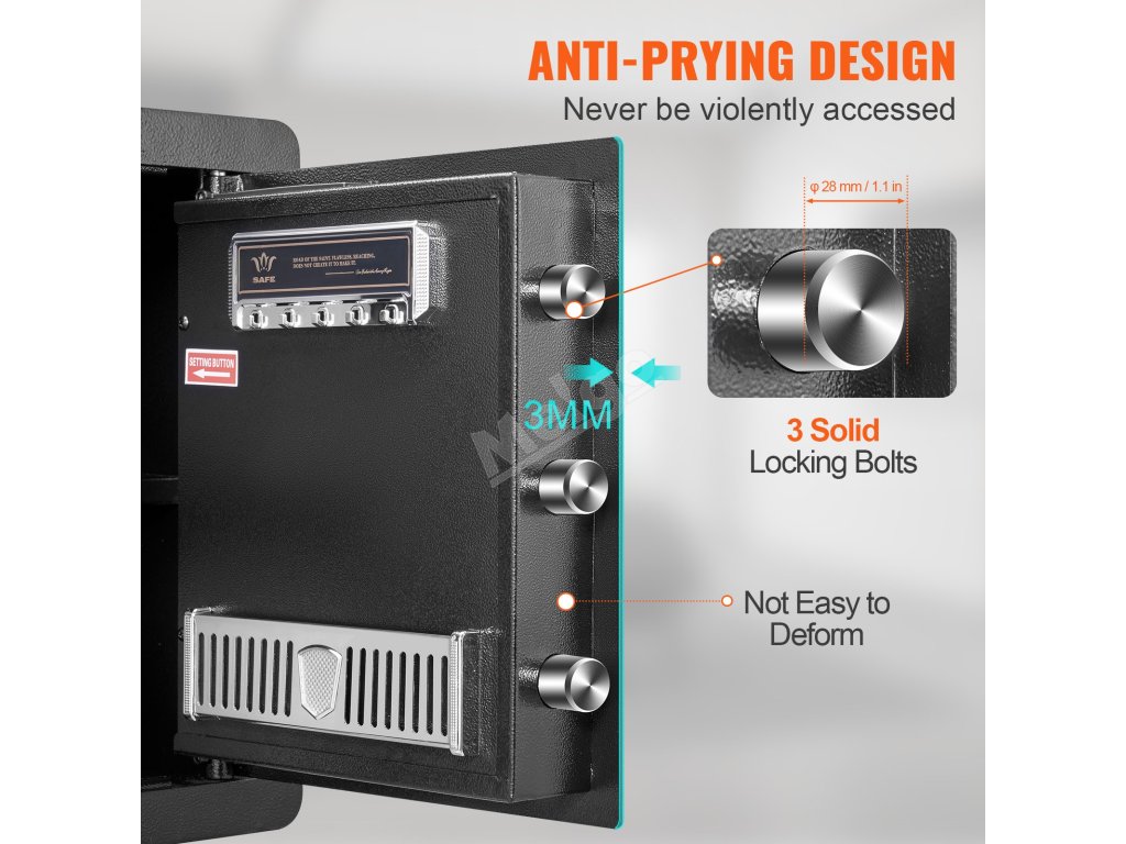Trezor VEVOR je vyrobený z vysokokvalitnej ocele. Jeho pevná konštrukcia zaručuje dlhodobú odolnosť. Silné dvere a bezpečné uzamykacie skrutky zvyšujú bezpečnosť. Tento trezor bol navrhnutý tak, aby odolal pokusom o vlámanie. Oceľové telo je odolné voči ohýbaniu a vypáčeniu. Ponúka vysokú úroveň ochrany vašich cenností. Robustná konštrukcia trezora z neho robí spoľahlivú voľbu. Tomuto trezoru môžete dôverovať, že vaše predmety budú v bezpečí. Odolná konštrukcia tiež zaručuje, že zostane funkčný dlhé roky. Investícia do tohto trezoru znamená, že si zabezpečíte svoj drahocenný majetok spoľahlivým výrobkom.