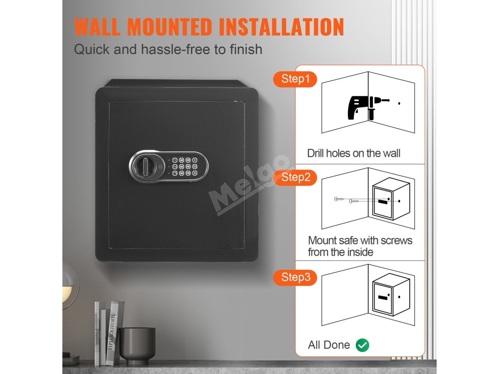 Proces nastavenia je veľmi jednoduchý. Pokyny sú jasné a dajú sa ľahko dodržiavať. Môžete ho uviesť do prevádzky v priebehu niekoľkých minút. Trezor sa dodáva s predvŕtanými otvormi na montáž na stenu. Táto funkcia vám umožňuje jednoduché upevnenie na stenu. Montážny hardvér je súčasťou balenia, vďaka čomu je tento proces bezproblémový. Okrem toho ho môžete priskrutkovať k podlahe, aby ste zvýšili bezpečnosť. Jednoduchá inštalácia vám zaručí, že trezor začnete používať okamžite. Táto funkcia je dôležitá pre tých, ktorí rýchlo potrebujú bezpečné úložné riešenie. Trezor VEVOR ponúka pohodlie aj bezpečnosť hneď po vybalení.
