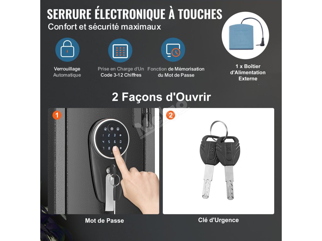 Trezor na střelné zbraně je vybaven inteligentním zámkem na heslo s panelem s dotykovou obrazovkou, který podporuje 3-12místná hesla. Kromě toho jsou k dispozici dva náhradní klíče a externí napájecí box pro případ nouze, když se vybije baterie nebo nejsou k dispozici klíče.