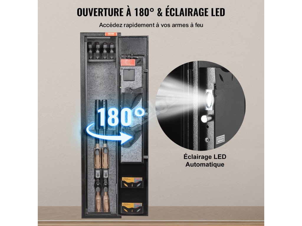 Náš trezor na dlouhé zbraně se dodává kompletně sestavený a lze jej ihned po vybalení z krabice používat. Dveřní panel se otevírá až do úhlu 180 stupňů a umožňuje snadný přístup ke střelným zbraním. Automatické LED světlo uvnitř trezoru navíc umožňuje snadné vyhledávání i za zhoršených světelných podmínek.