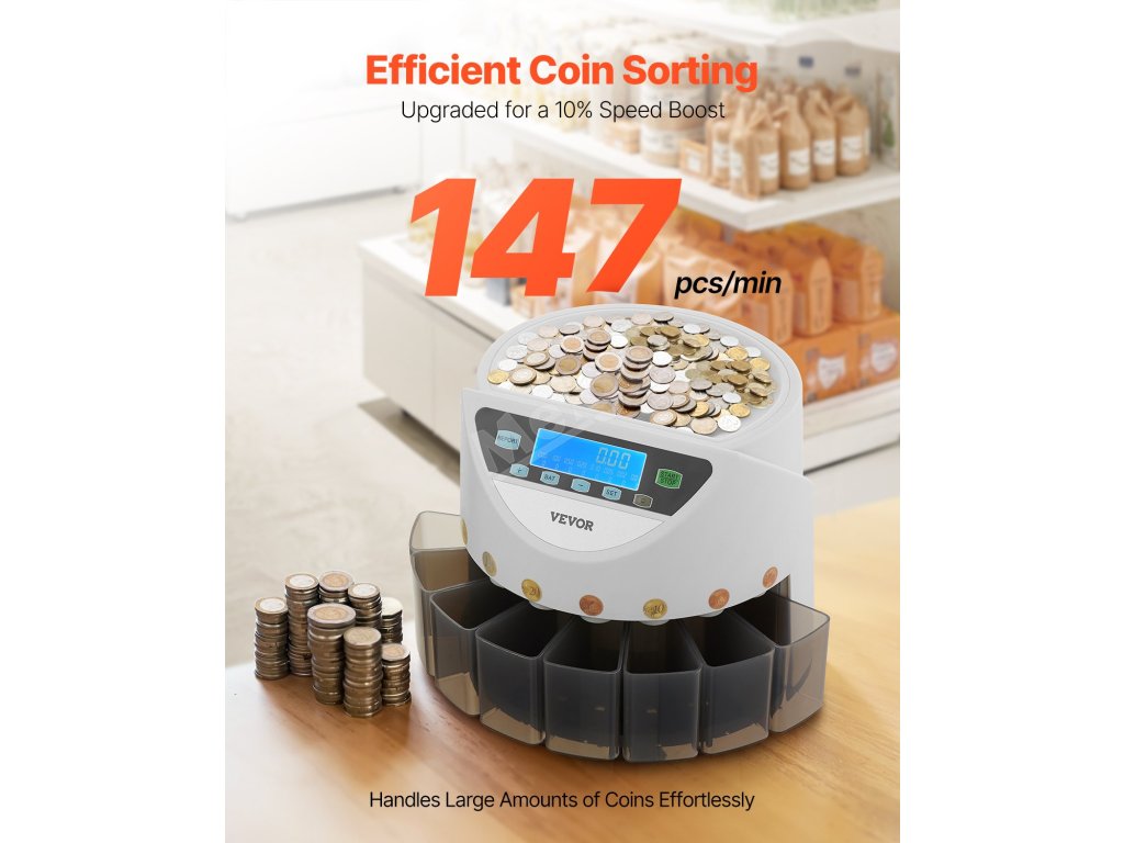 Třídička mincí dokáže rychle třídit až 147 kusů/min, což zvyšuje rychlost třídění o 10 % ve srovnání s tradičními metodami.