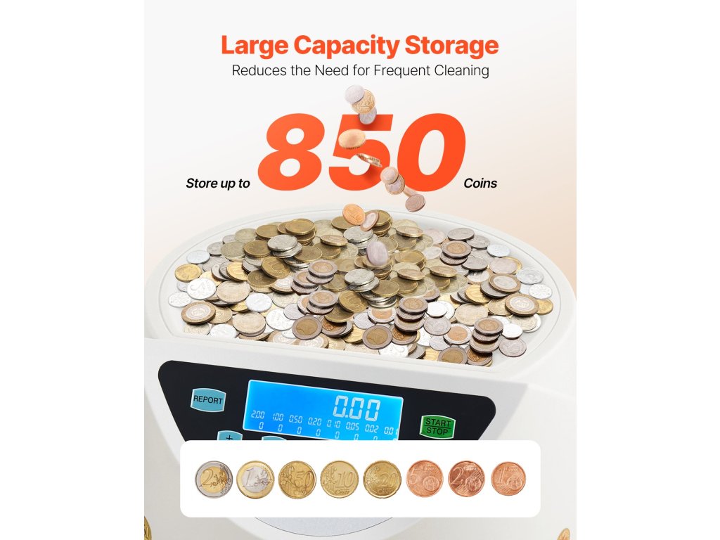 Velkokapacitní počítačka mincí pojme až 850 mincí, takže můžete průběžně počítat více mincí, aniž byste museli často měnit pouzdra na mince.