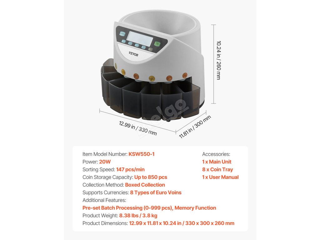 Třídič a počítadlo pro 8 euro mincí, kapacita 850, lcd, 5 trubic