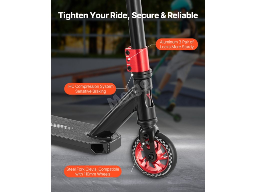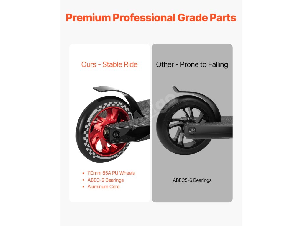 Stredne pokročilá kaskadérska kolobežka pre začiatočníkov je vybavená zosilnenou vidlicou so závitom z oceľovej zliatiny, ktorá je vybavená tichými 110 mm PU kolieskami, poskytujúcimi plynulú jazdu. Vďaka modernizovaným vysokorýchlostným guličkovým ložiskám ABEC-9 je vhodná na rýchlu jazdu.