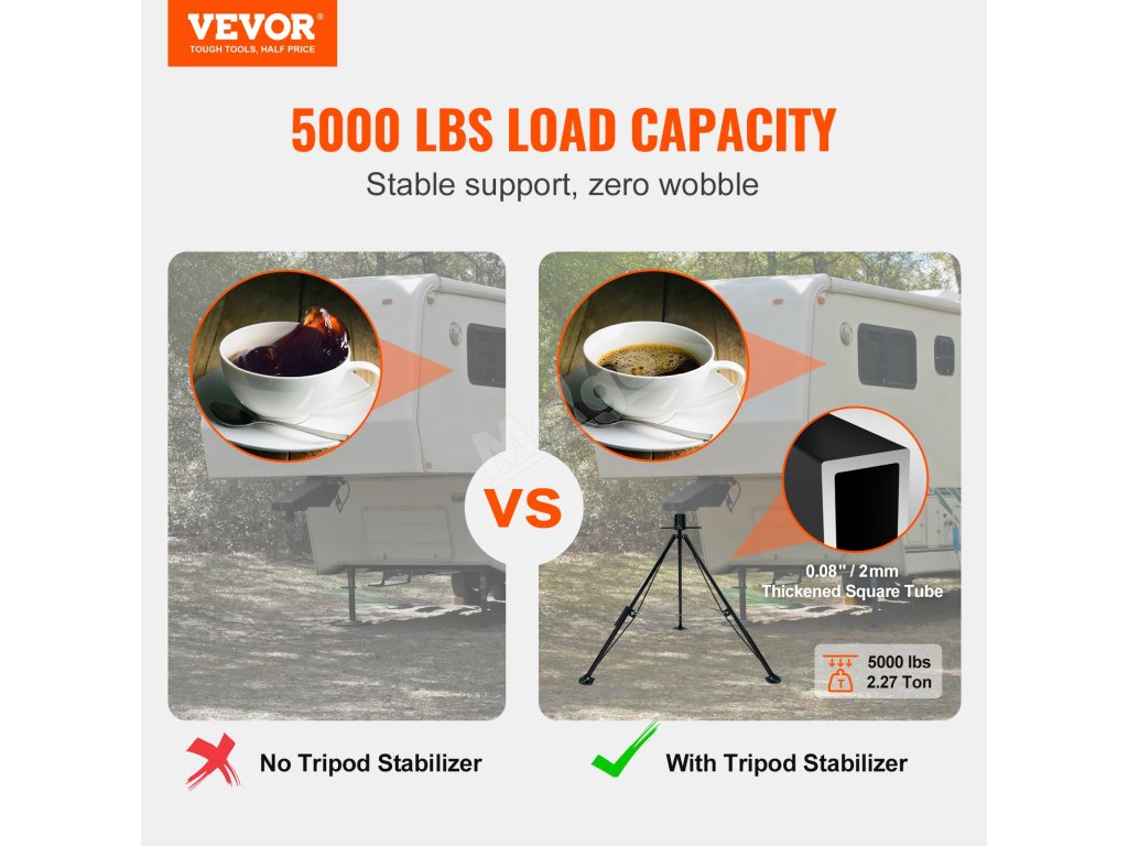 0.ocelové nohy o tloušťce 08"/2 mm, nosnost 5000 liber/2,27 tuny a trojúhelníková nosná konstrukce udrží váš obytný vůz stabilní při všech činnostech.