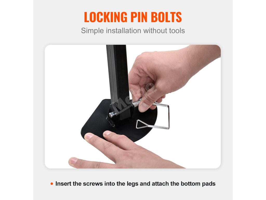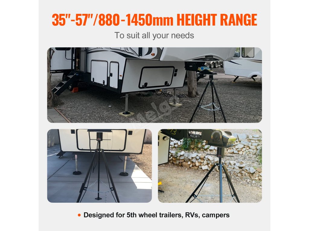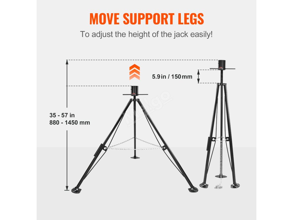 Výšku zvedáku snadno nastavíte posunutím podpěrné nohy směrem dovnitř nebo ven. Rozsah nastavení je od 35" do 57". Použijte stabilizátor točnice, abyste zabránili kývání přívěsu. A stabilizátor umožňuje skládání pro bezproblémové použití a skladování.