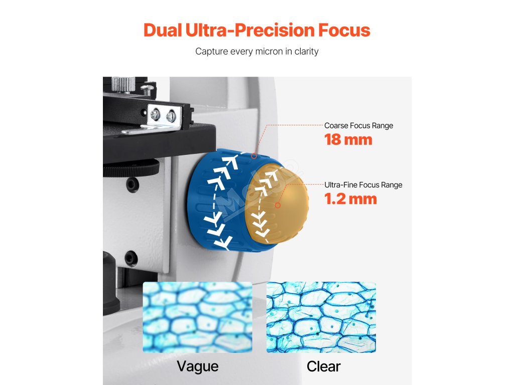 Tento mikroskop je vybaven 18mm hrubým zaostřením a 1,2mm jemným zaostřením v kombinaci se zdrojem světla LED a kondenzátorem, které zachycují každý mikronový detail a poskytují úžasně jasné snímky.
