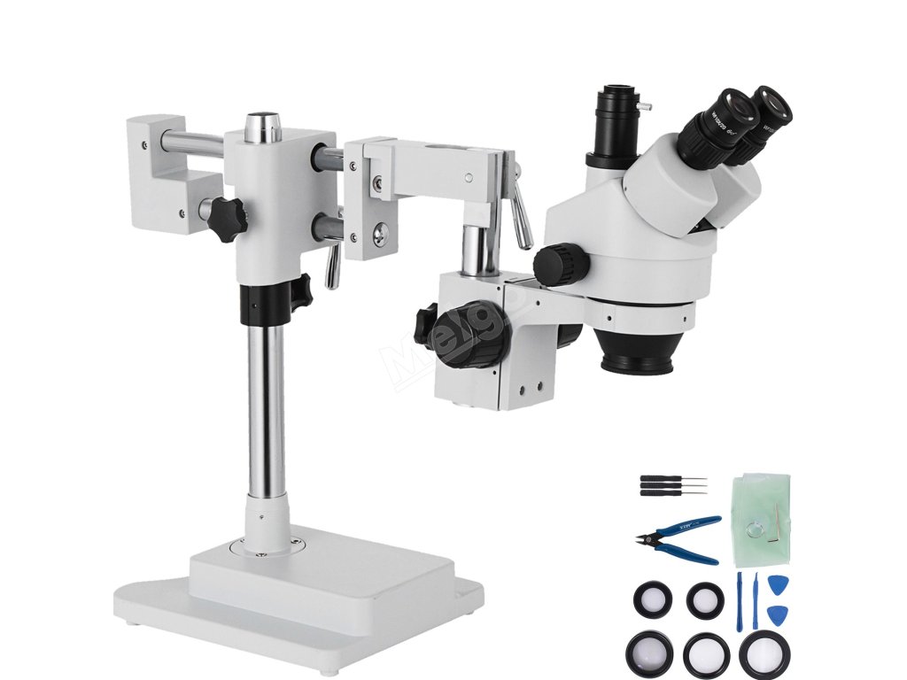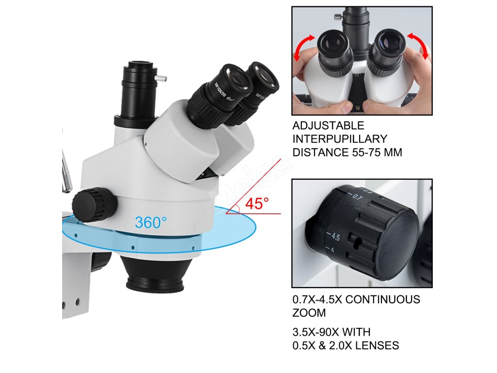 Trinokulární stereo mikroskop 3,5×–90×, 360° otočný, dvouramenný