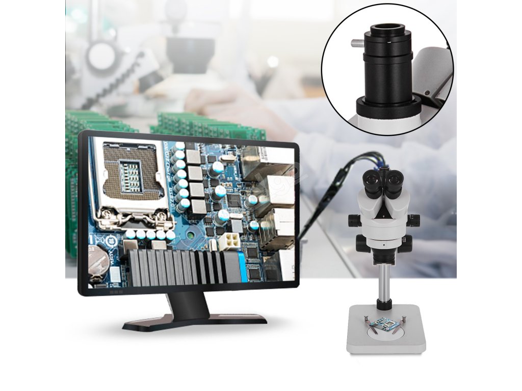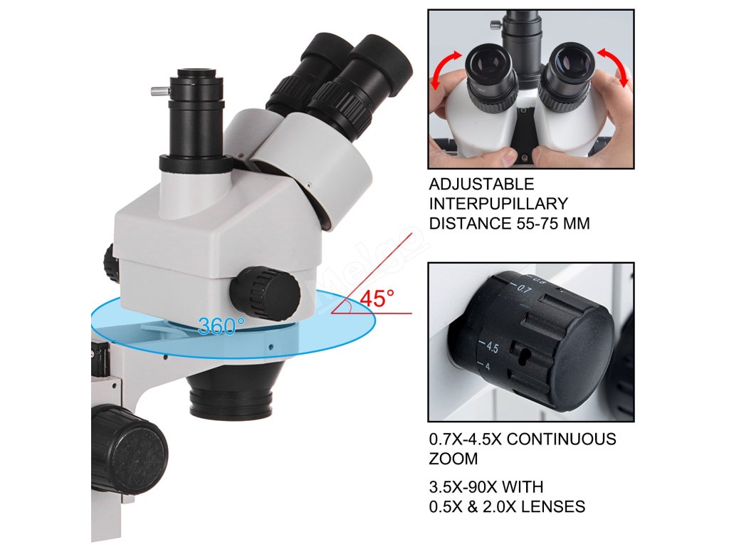 Tento výrobek je profesionální trinokulární stereomikroskop navržený tak, aby splňoval požadavky mikroskopie. Má rozsah zvětšení 3,5x-90x při použití s 0,5x a 2,0x objektivy (jsou součástí dodávky). Digitální mikroskop má nastavitelnou pracovní vzdálenost, mezipupilární vzdálenost a dioptrie. Je široce používán pro opravy pájecích desek plošných spojů, pozorování hmyzu, identifikaci šperků atd.