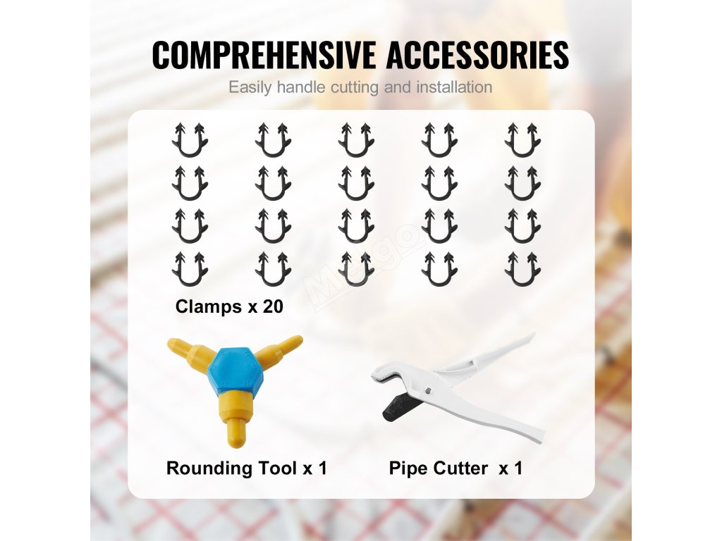 Naše sálavé tepelné trubky AL PEX se dodávají s kompletní sadou příslušenství včetně řezačky trubek, nástroje na zaoblení a 20 svorek pro pohodlné řezání a instalaci. Je ideální pro různé systémy připojení a typy podlah včetně dřevěných podlah, mramoru, betonu a dlaždic.