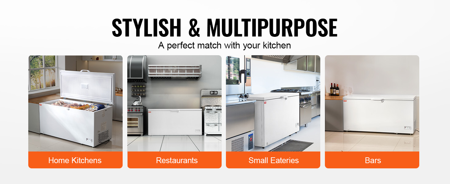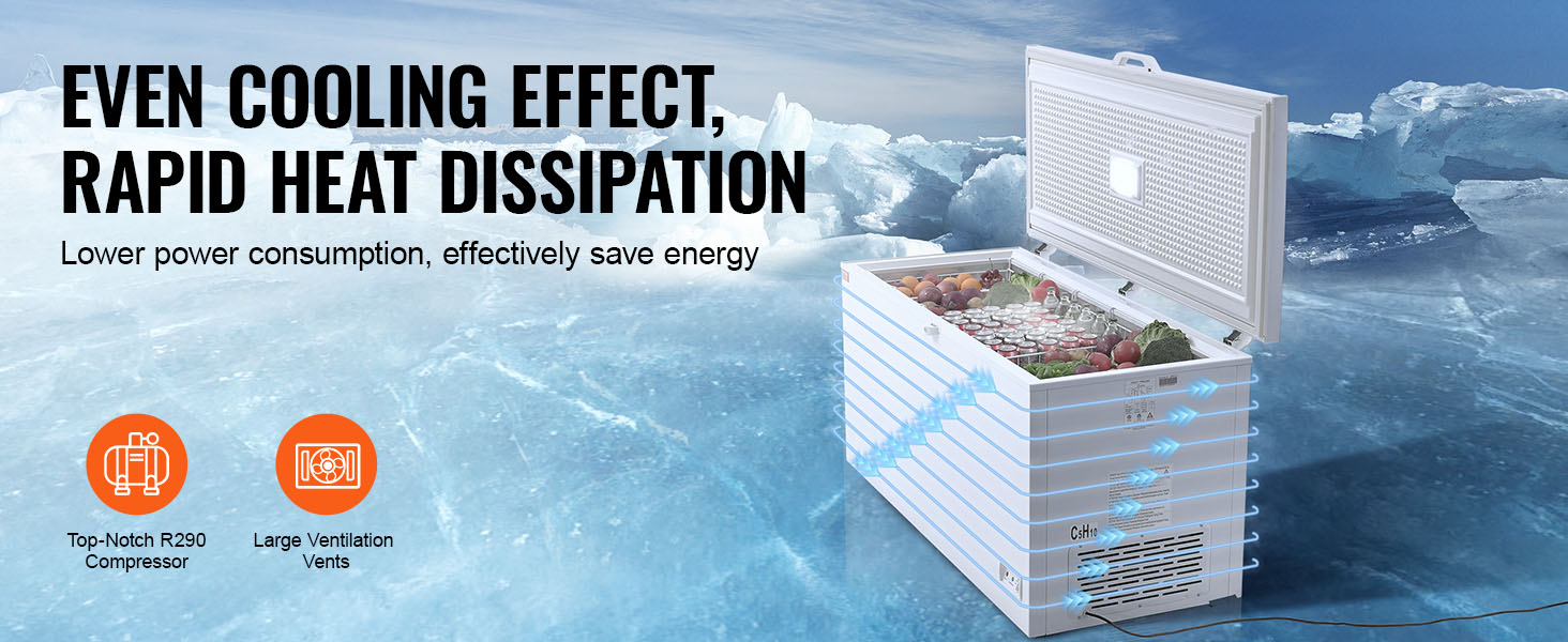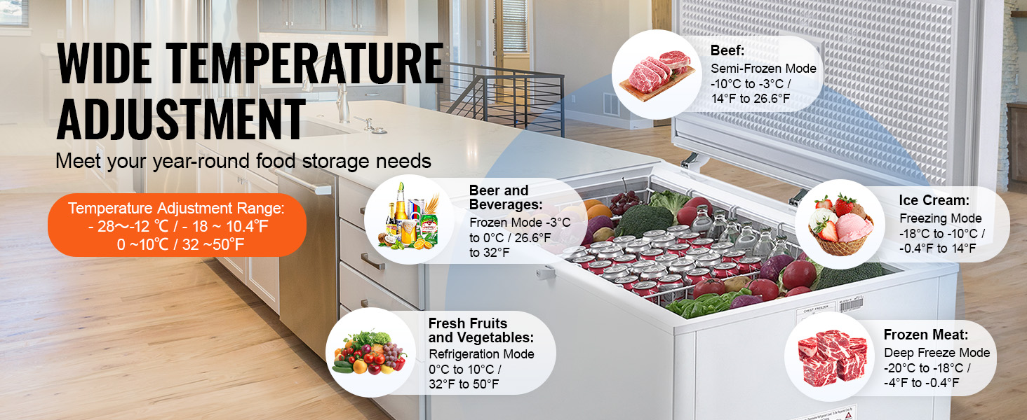 Truhlicová mraznička VEVOR s velkorysým objemem 17,2 cm3 a 4 vyjímatelnými koši je ideální pro skladování všeho od krůt až po pizzu a menší předměty, takže suroviny zůstanou déle čerstvé a chladné. Je navržena se 7 teplotami pro zmrazení různých položek podle vašich potřeb.